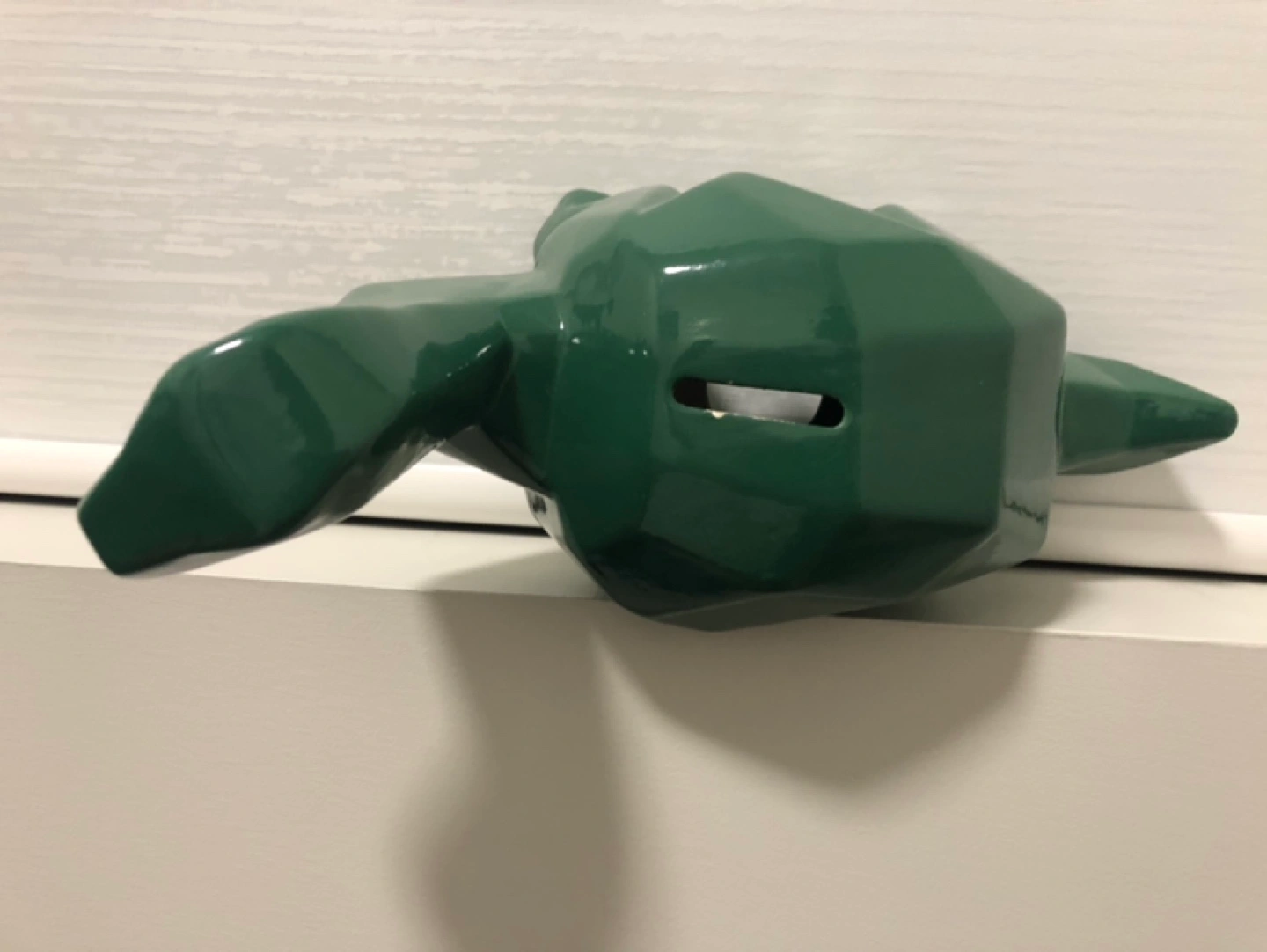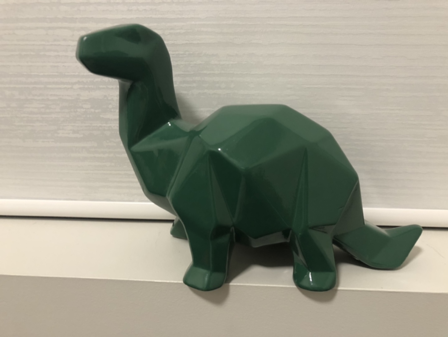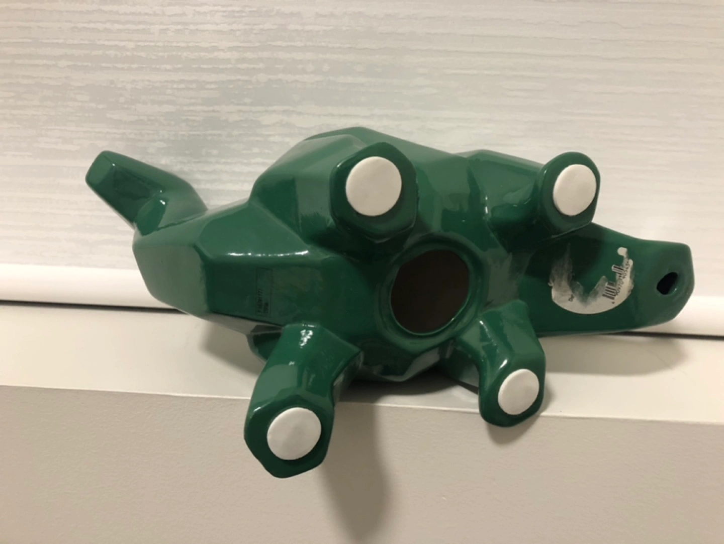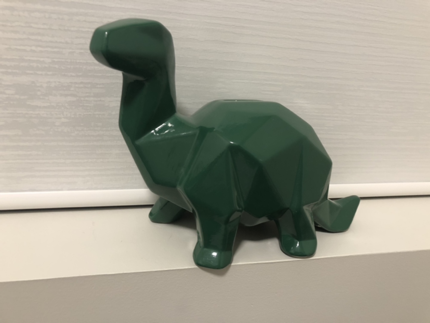 Green ceramic dinosaur shaped piggy bank. Low-poly design. Has a slot on top for coins, but is MISSING the bottom. (still good decor)