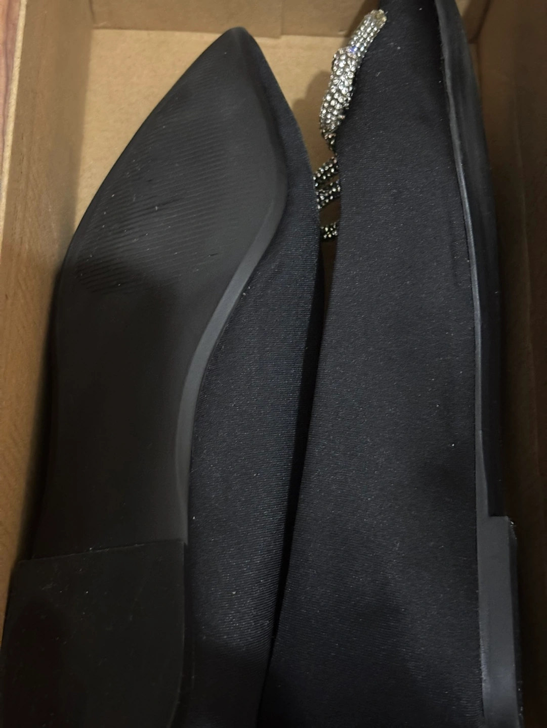 Black satin fabric. Rhinestone embellished bows.