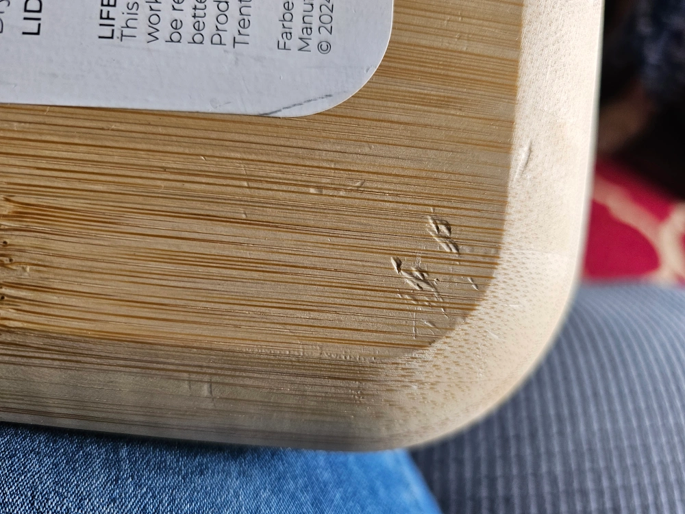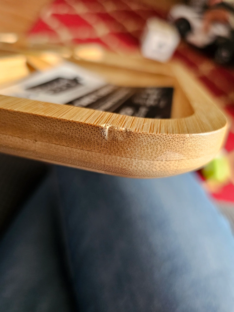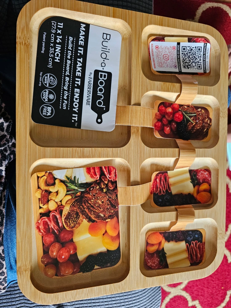 126Bamboo snack board (no lid). Sections for charcuterie. Minor cosmetic damage to corners. 11x14 inches. Never used.