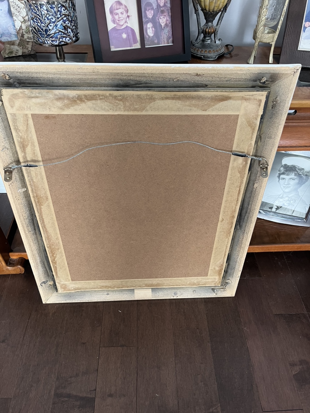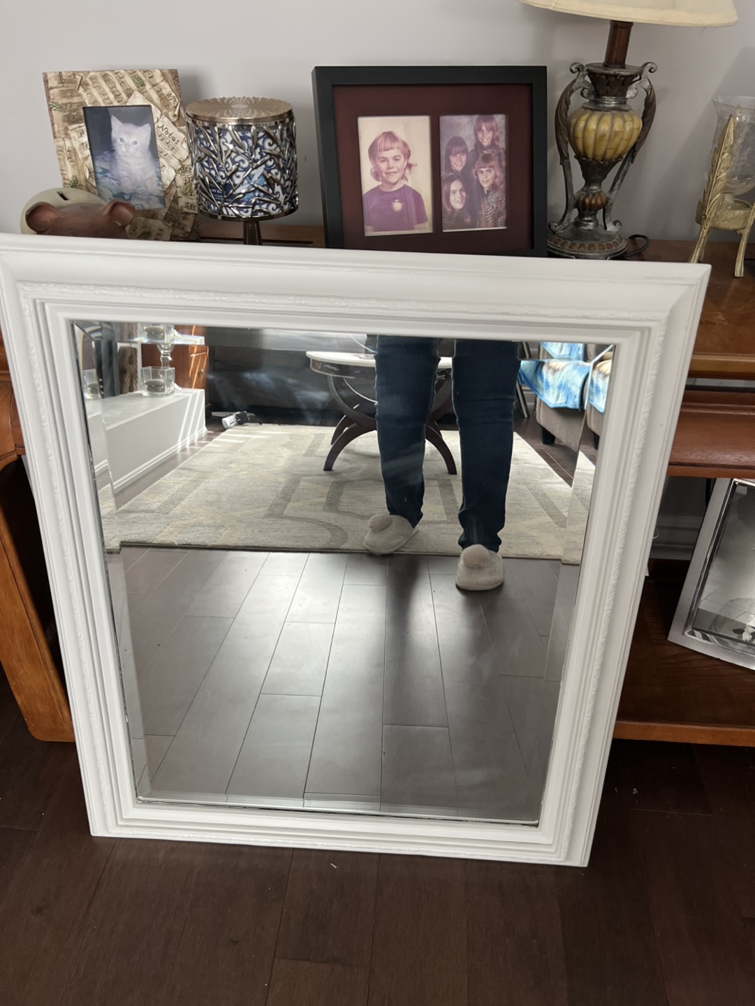 Large rectangular mirror. Solid Wood. White painted decorative frame. Ready to hang. Fastest pick up please.