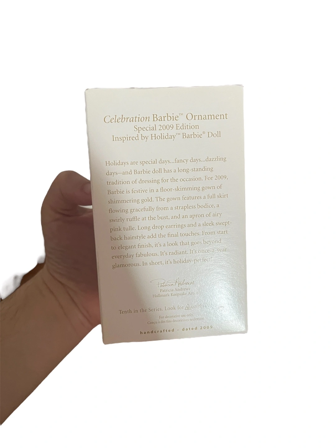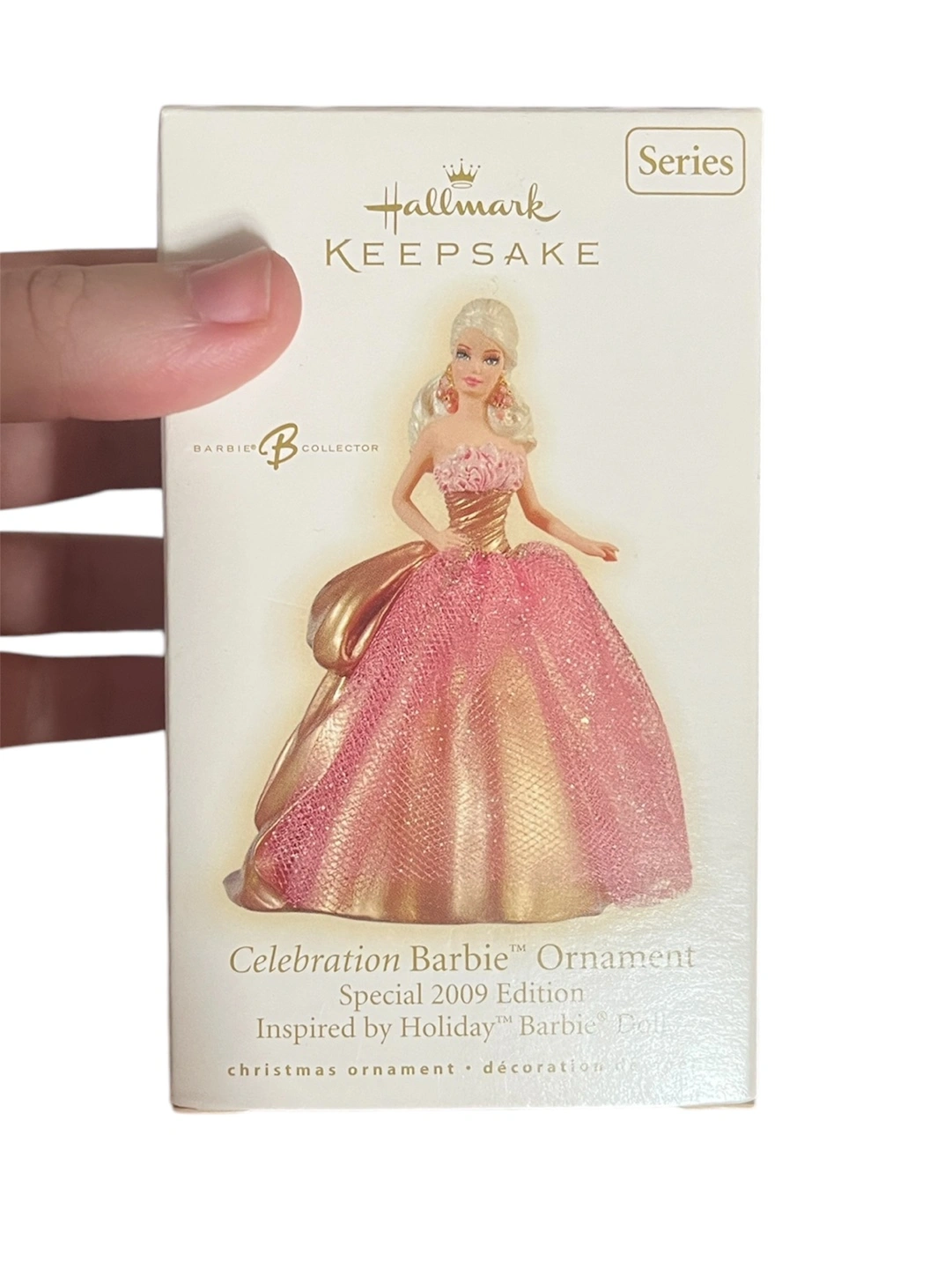 Hallmark Keepsake Barbie ornament. Special 2009 Edition. Inspired by Holiday Barbie doll. Tenth in the series. Handcrafted and dated 2009. Pink and gold dress. Comes in original packaging.