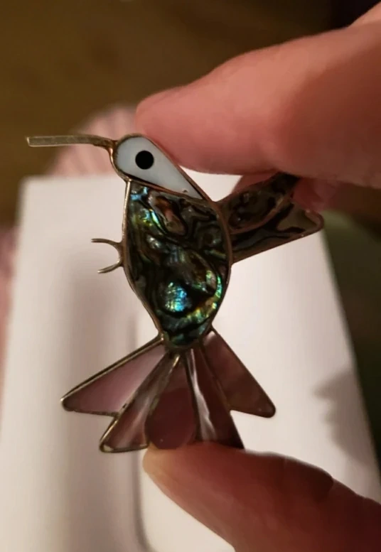 Beautiful hummingbird brooch. Features iridescent abalone shell. Silver-toned metal. Pin back closure. 2.5" approx.