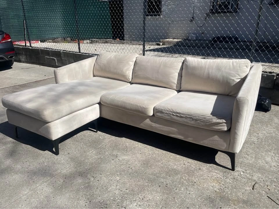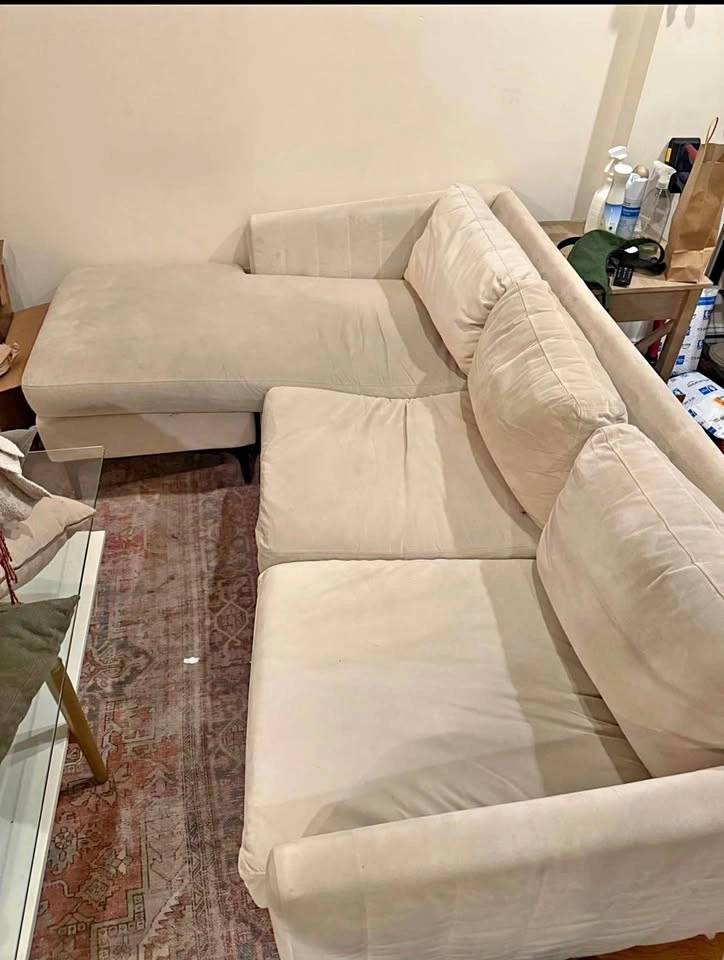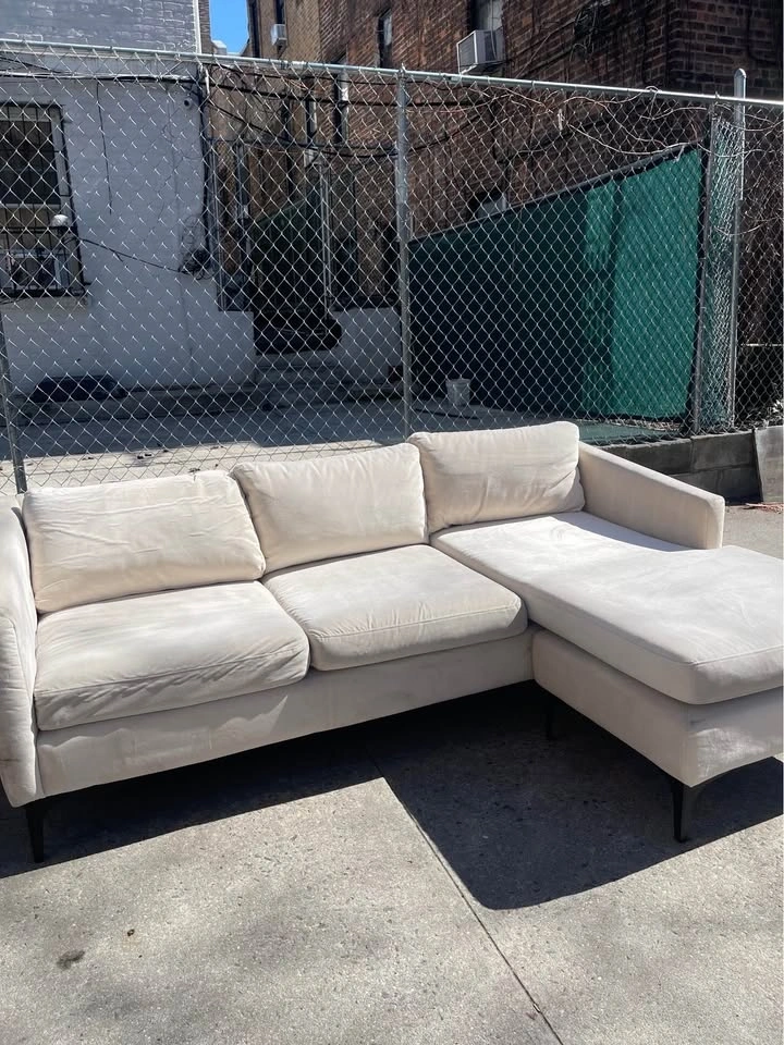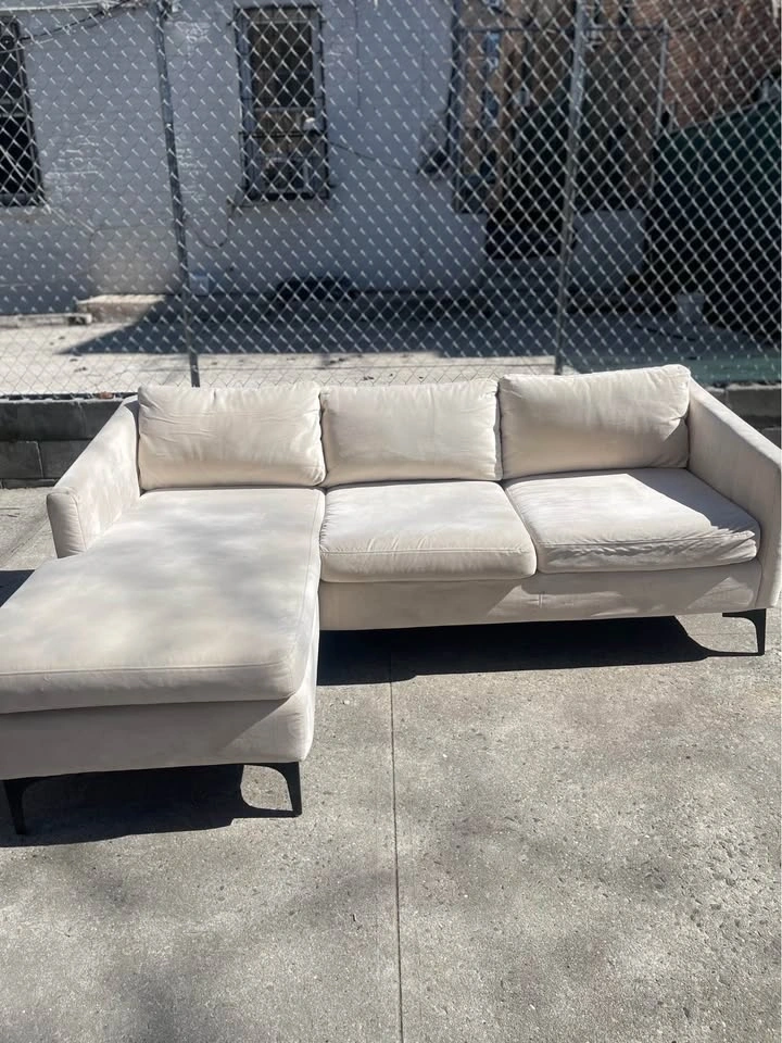 Light beige color suede like sectional couch seats 3-4 people comfortably. Beautiful beige sectional couch with reversible chaise. This sofa is extremely comfortable and perfect for relaxing, watching movies, or hosting guests. The neutral color works well with almost any living room style. The cushions are thick and plush. Covers are removable and machine washable and the couch has a modern, cozy look that fits great in apartments, houses, or family rooms. I don’t have the dimensions but it fits in any room. Pick up is in the Bronx.