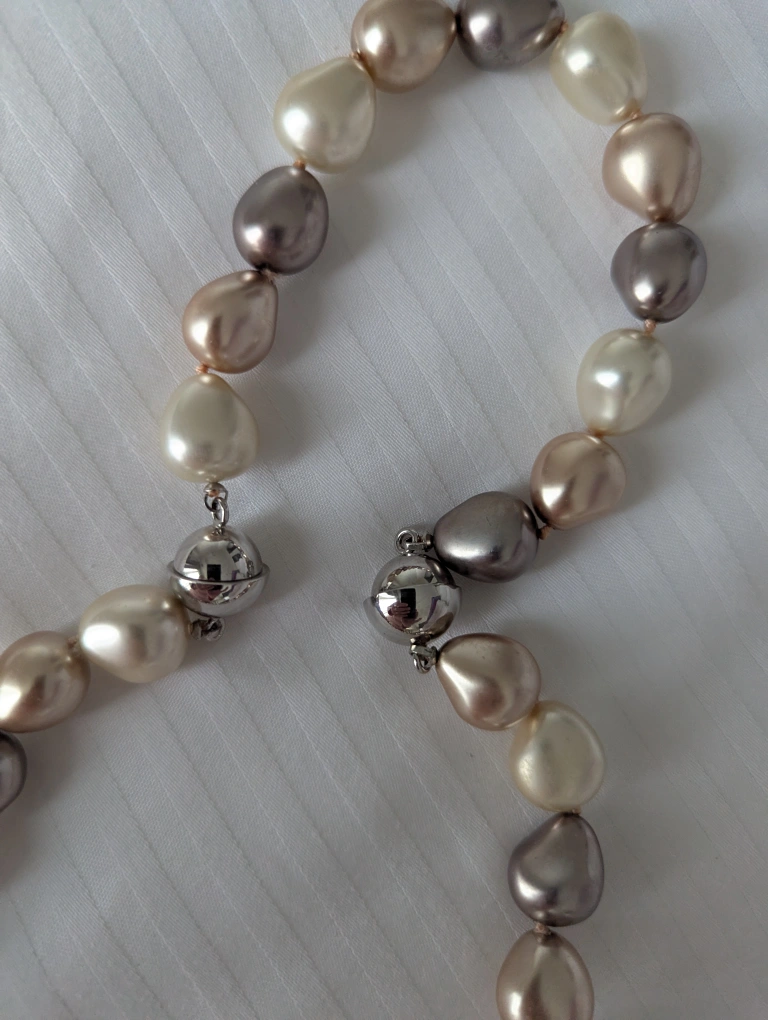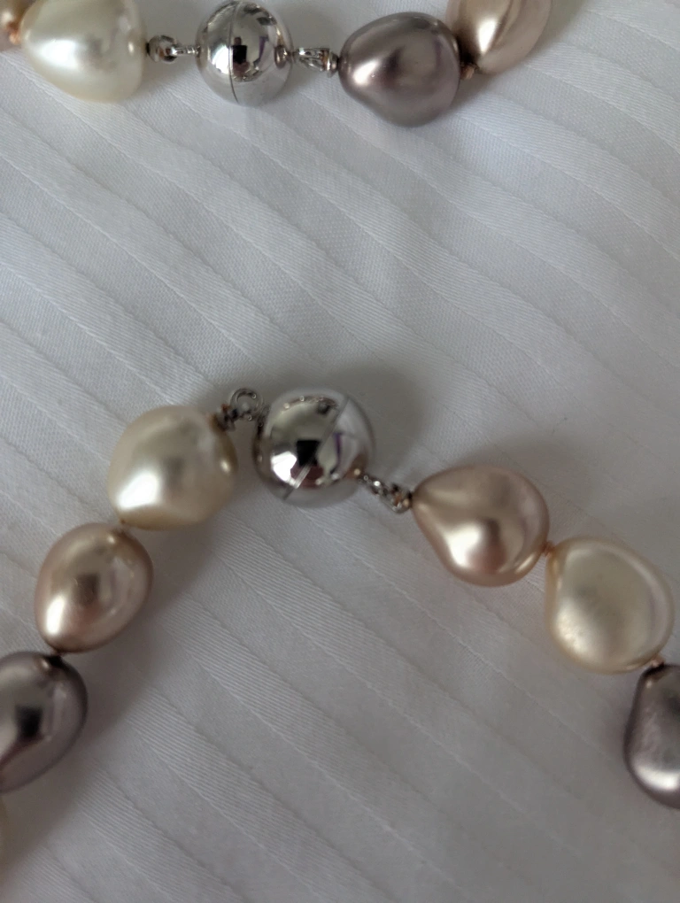 Beautifu and versatile multi-toned pearl set includes a bracelet that can be worn separately or added to lengthen the necklace. Features large, lustrous pearls in shades of cream, taupe, and grey. Magnetic clasps. Matching drop earrings.