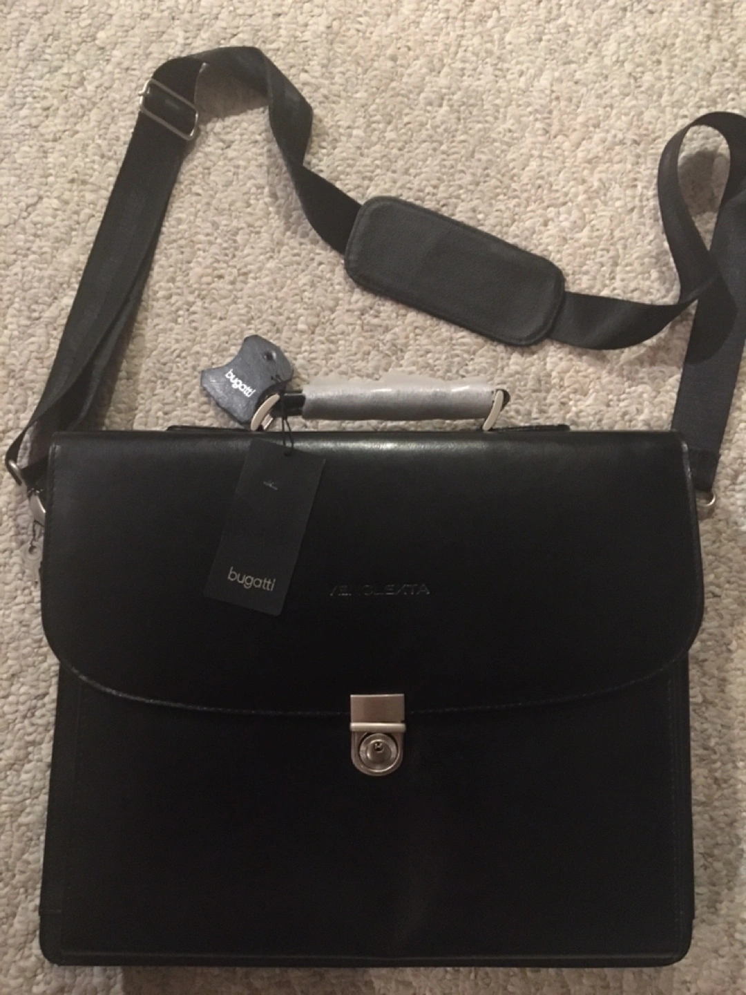 Bugatti black leather locking briefcase that's in brand new condition (tags attached, never even opened), ready to carry your essentials in style. Its sleek design features a secure closure and a comfortable shoulder strap, making it perfect for professionals on the go.