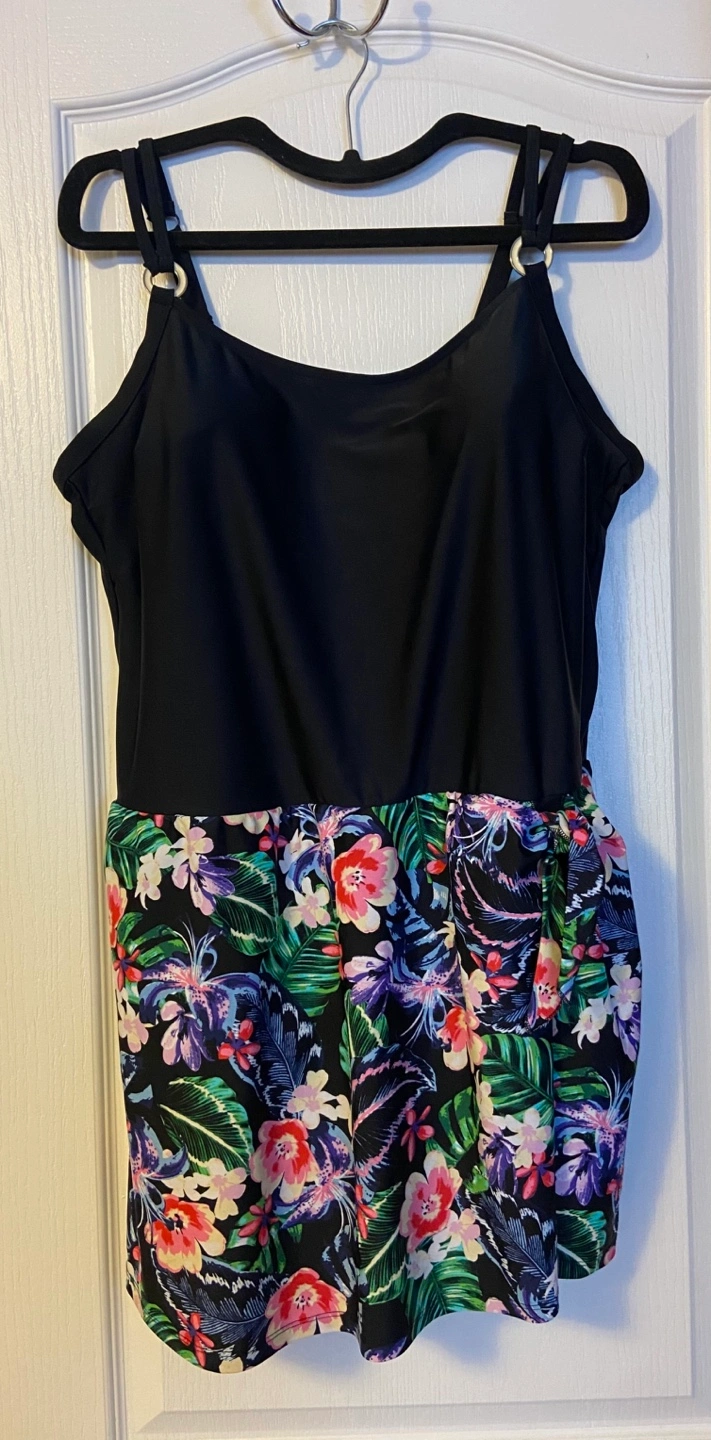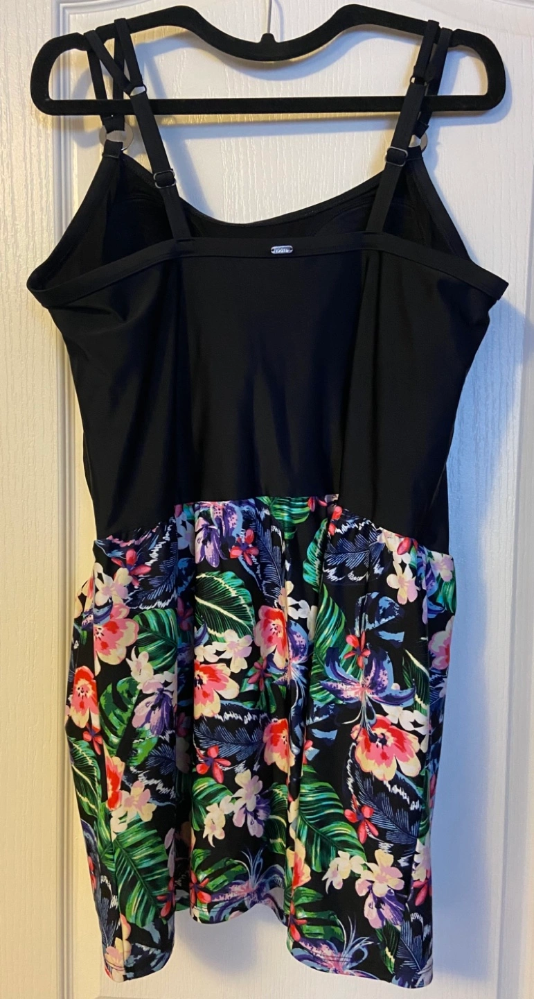 Beautiful black and tropical print swim dress. Features adjustable straps and a flattering fit. Size 20W. Made in Cambodia. Worn only a few times so looks like new!