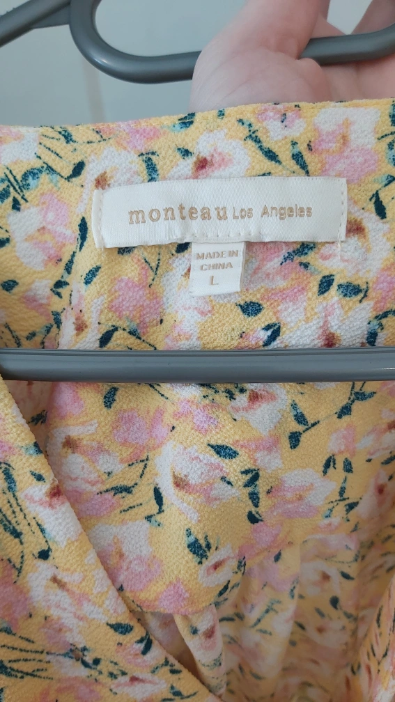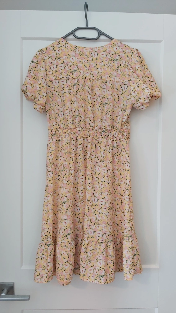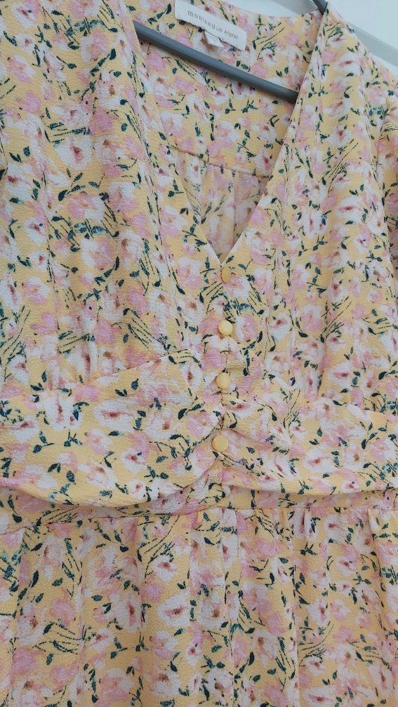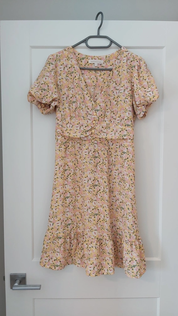 Cute yellow floral dress. Size large. Short puffy sleeves. Button front. Flowy skirt. Perfect for spring or summer.