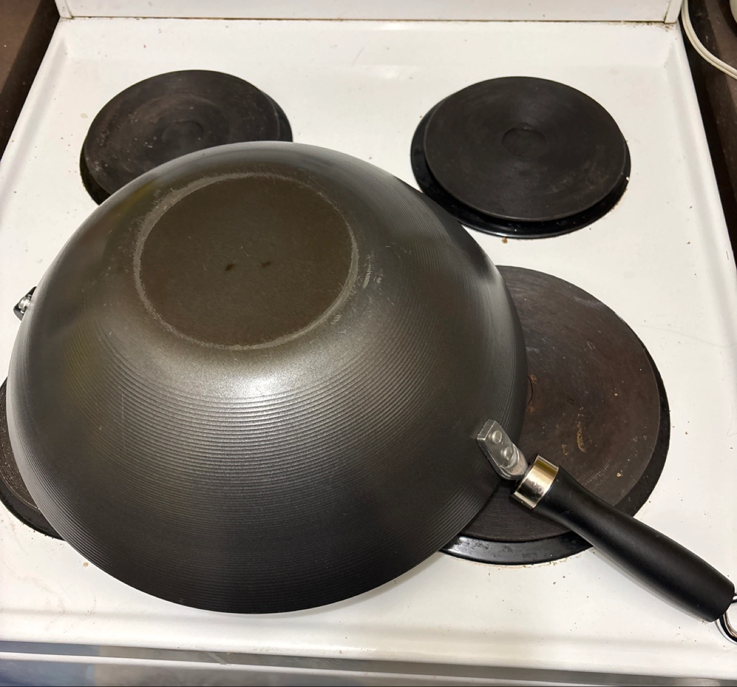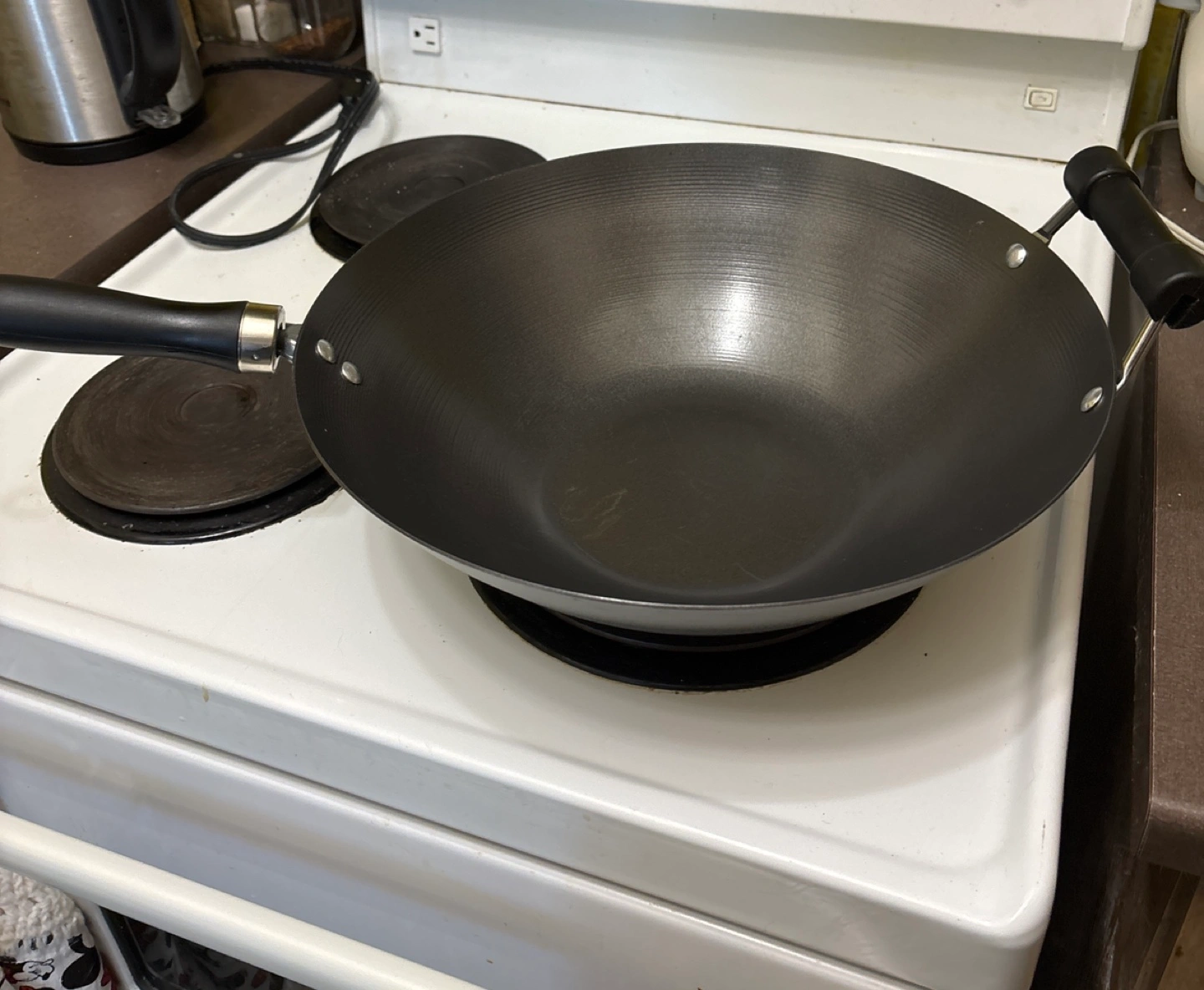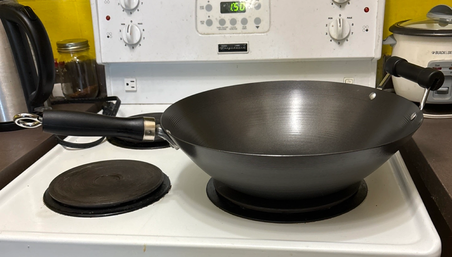 Large carbon steel wok. Black colour. Helper handle. Bought it with no lid. Good for stir-frying. Used only a handful of times. Good to go to a home where someone will use it regularly instead of it collecting dust in my kitchen cupboard.