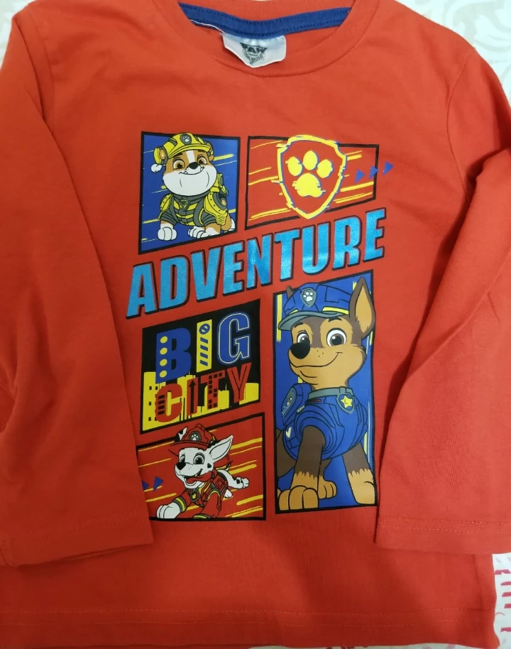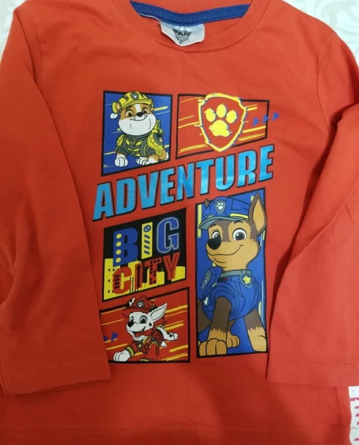 Adorable Paw Patrol outfit. Features a long-sleeved red shirt with graphic print. Paw Patrol logo and Adventure City text. Perfect for your little one.