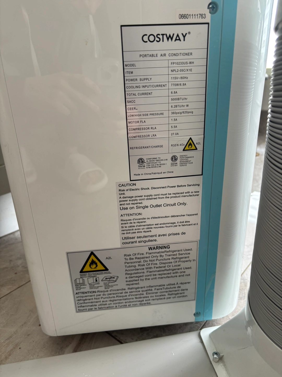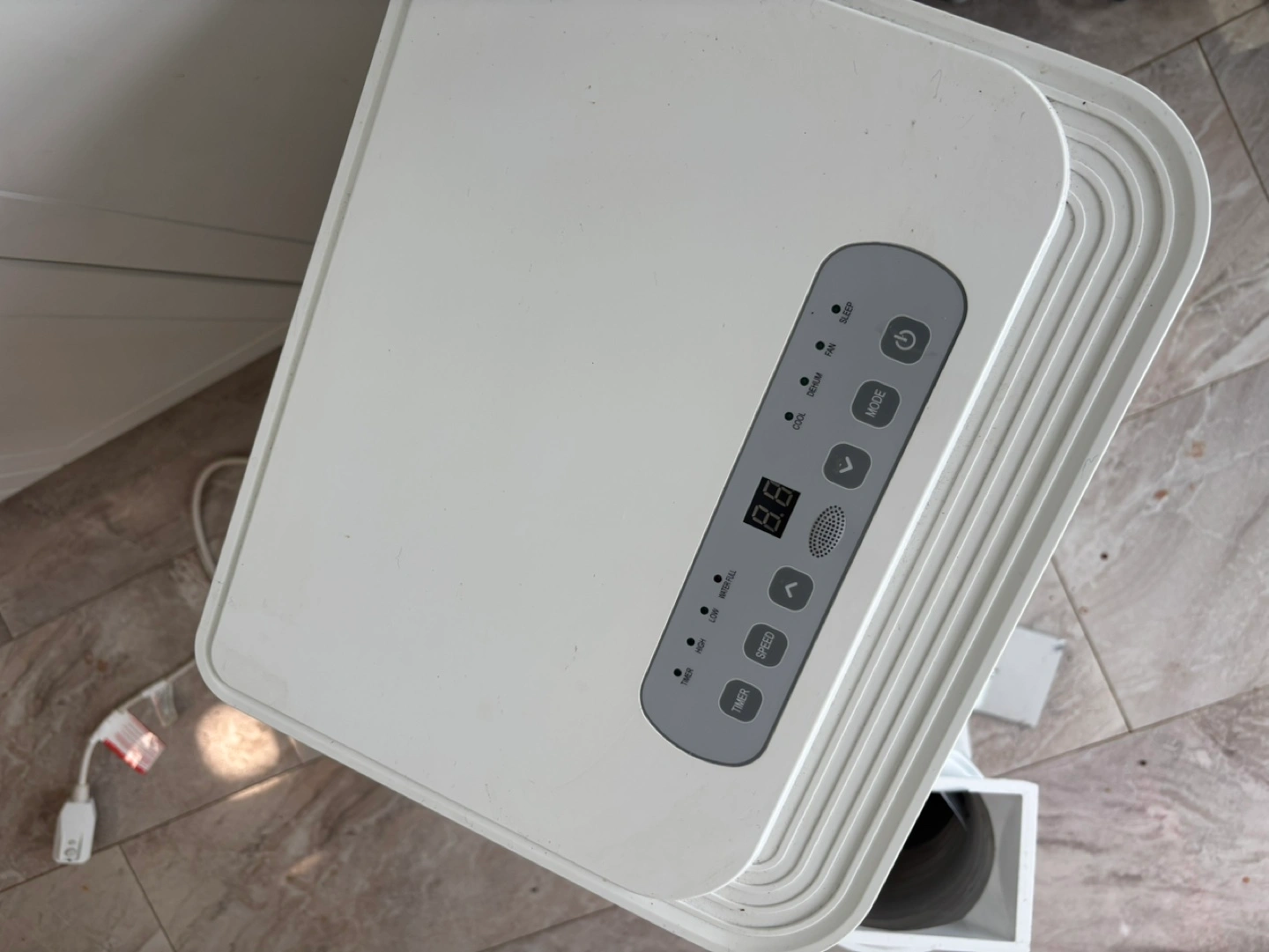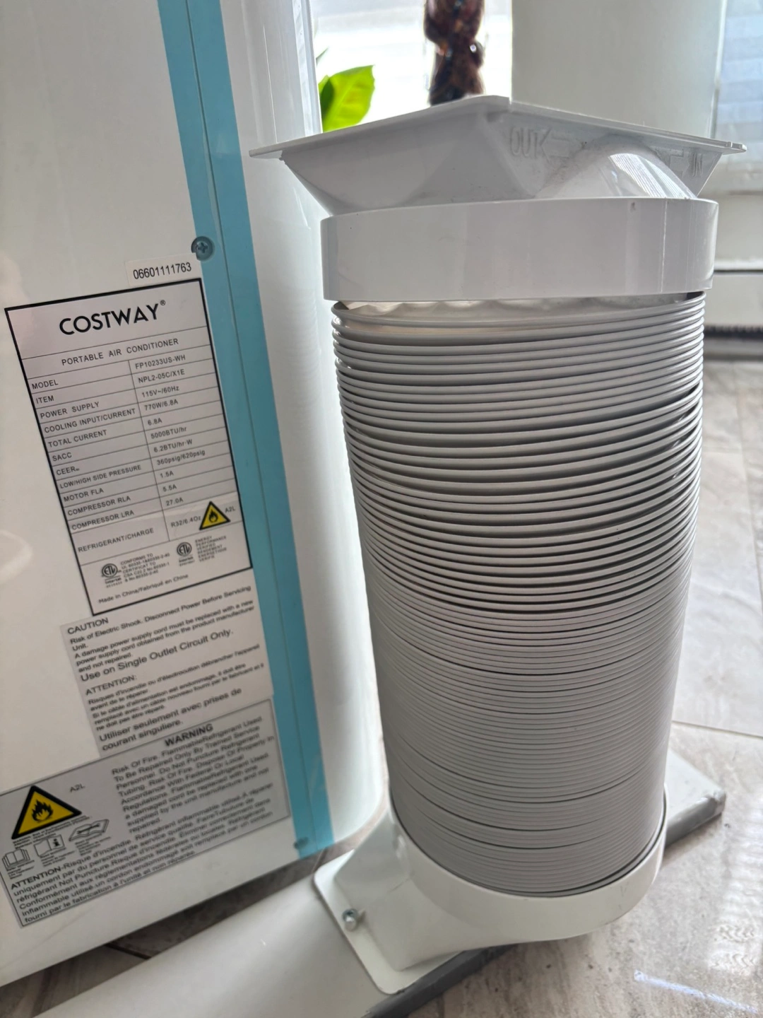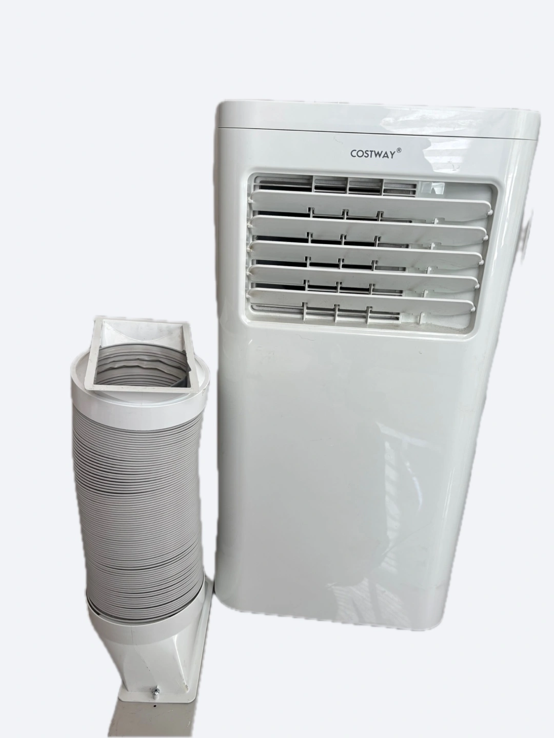 Portable air conditioner, includes exhaust hose. White. Good for smaller spaces. Features multiple settings.