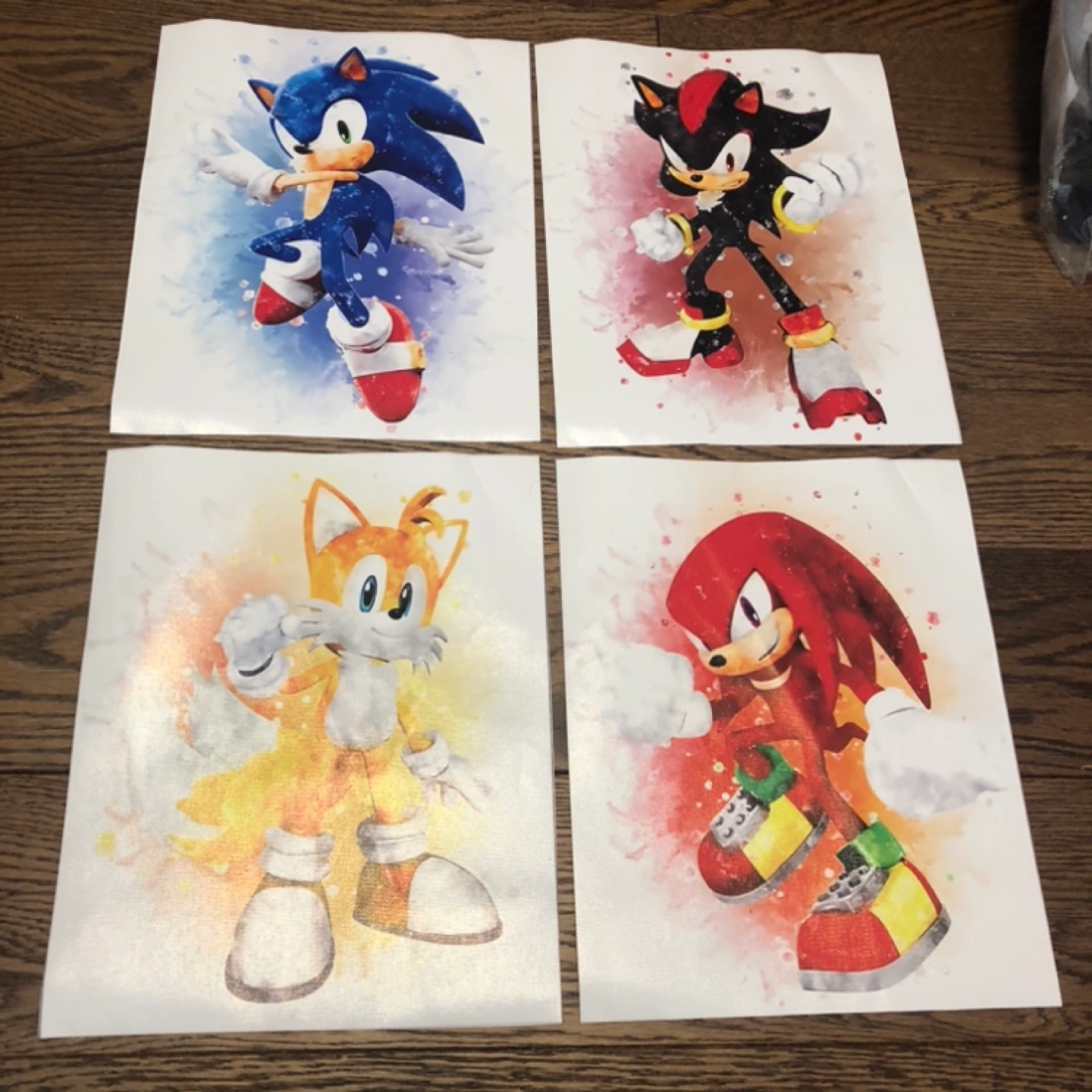 Four prints featuring Sonic, Shadow, Tails, and Knuckles. Watercolour style. New, never displayed.