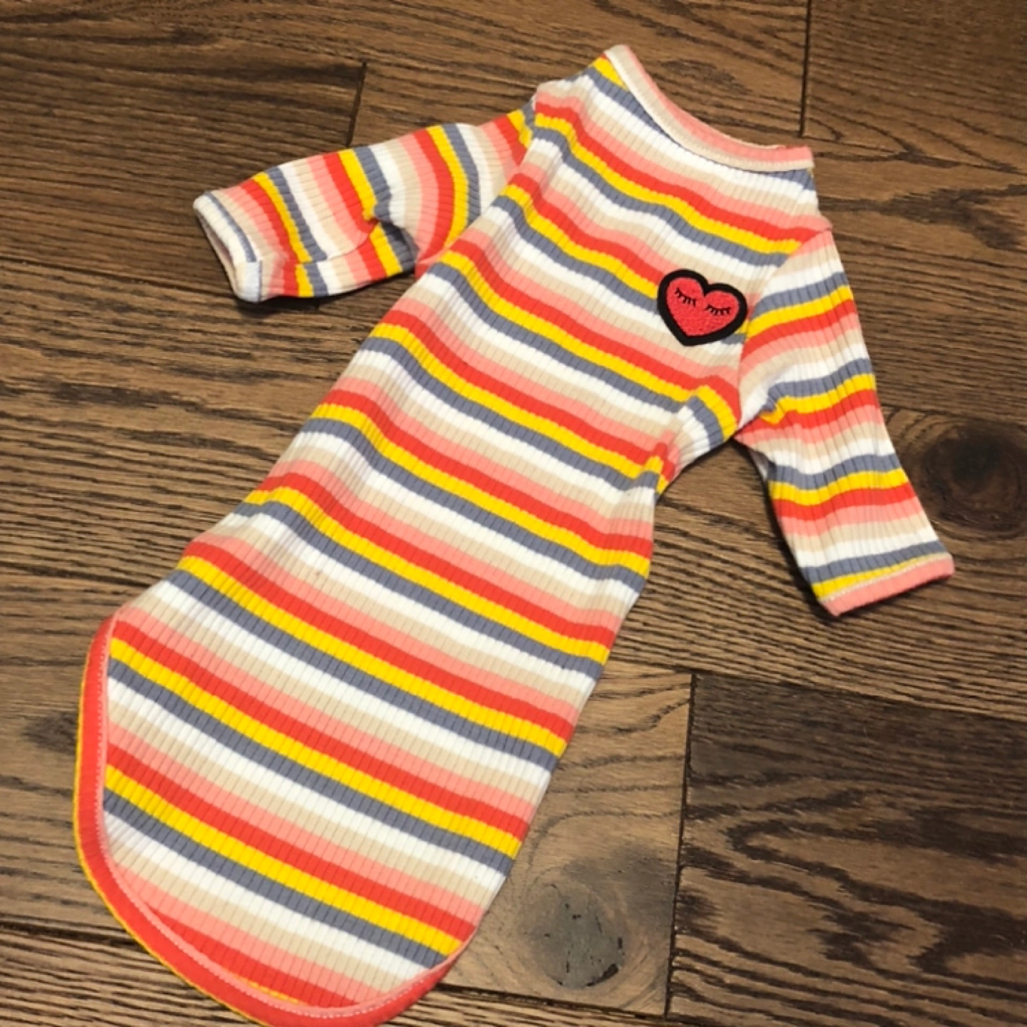 Multicoloured striped dog shirt. Features short sleeves and a cute heart patch. Soft and stretchy material. Perfect for your furry friend.