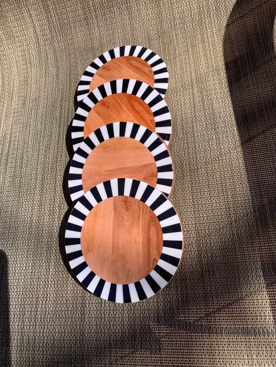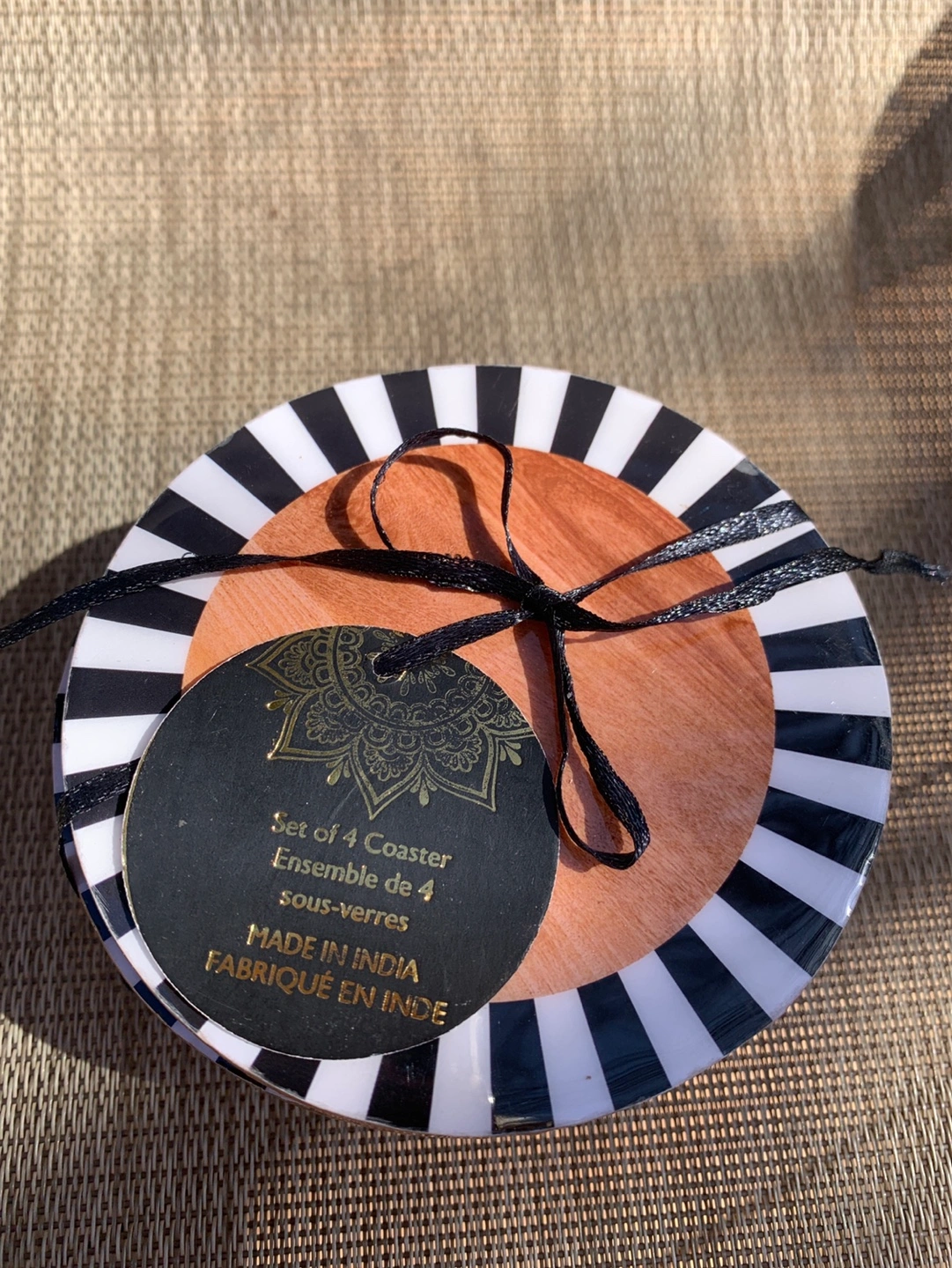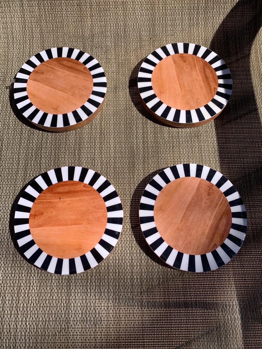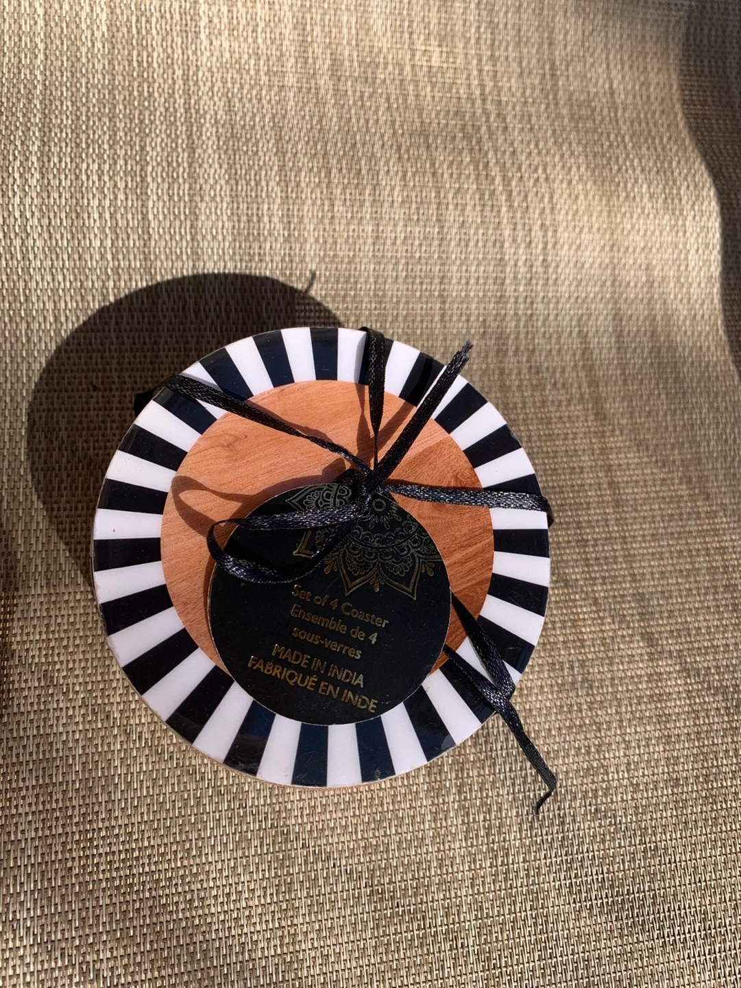 Lovely lacquered wooden 4/set of round coasters. Wooden top features a black and white striped resin border. They are hand crafted in India. Wipe clean with a soft cloth for maintenance. Quite a unique design super stylish for entertaining! Cash only please.