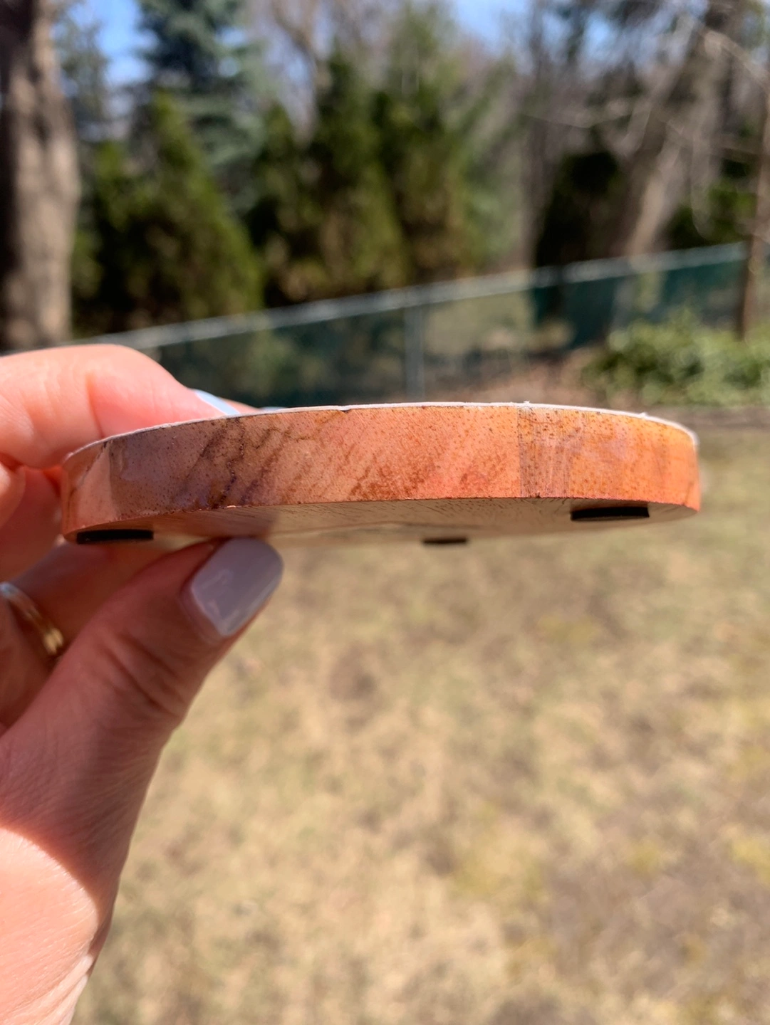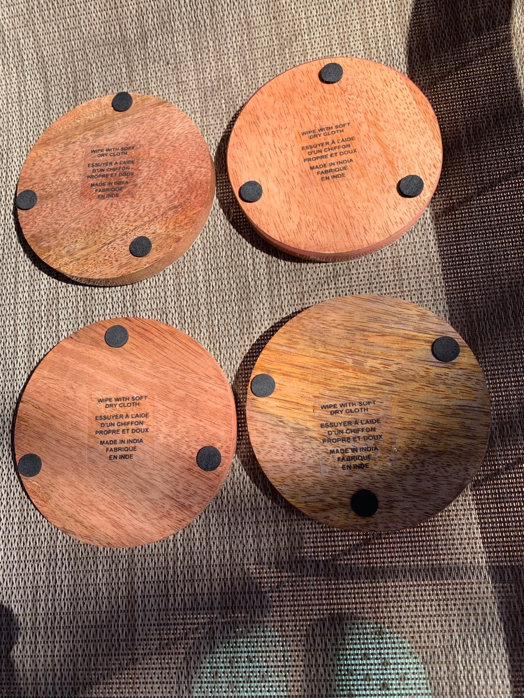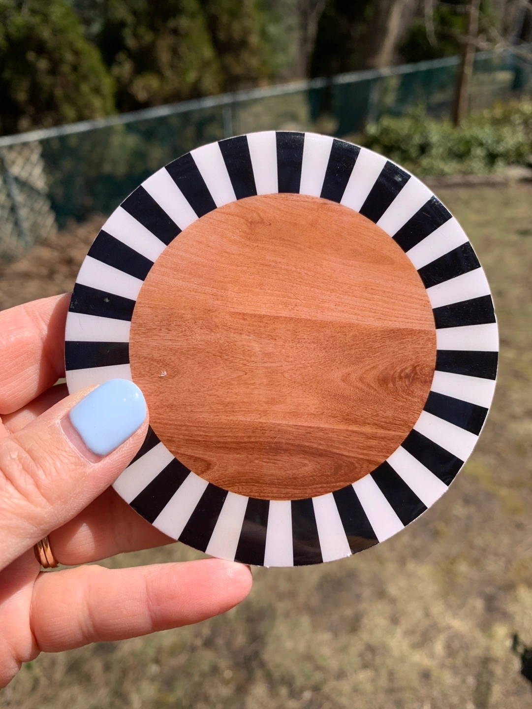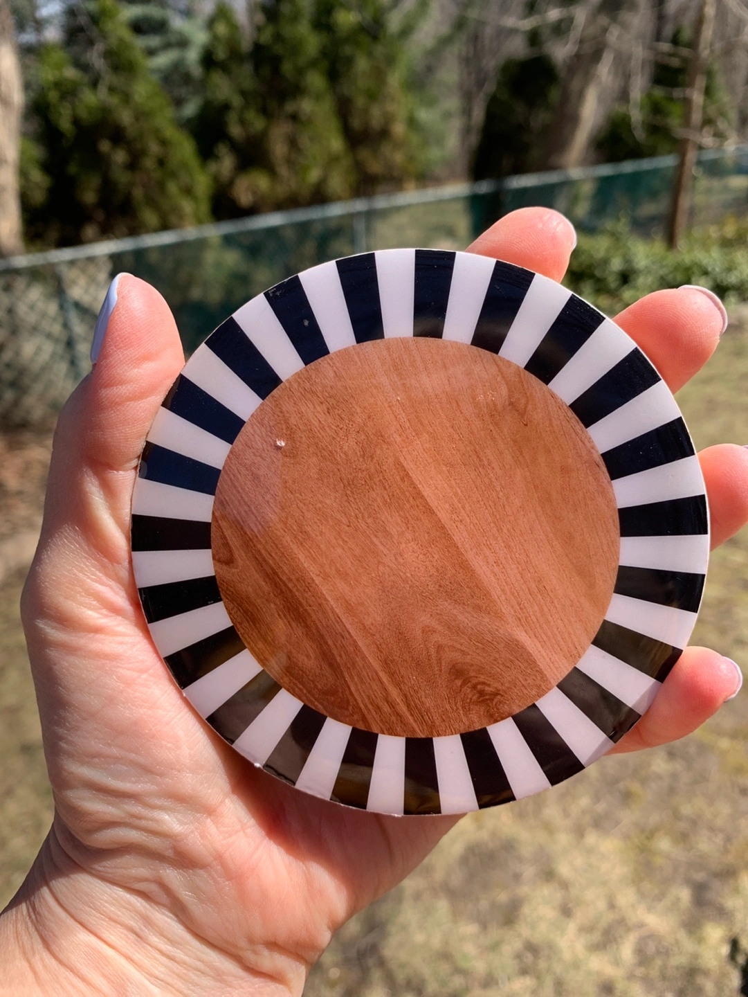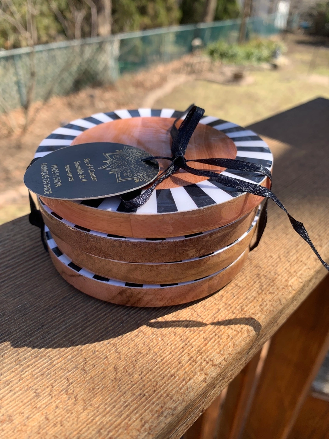 Lovely lacquered wooden 4/set of round coasters. Wooden top features a black and white striped resin border. They are hand crafted in India. Wipe clean with a soft cloth for maintenance. Quite a unique design super stylish for entertaining! Cash only please.