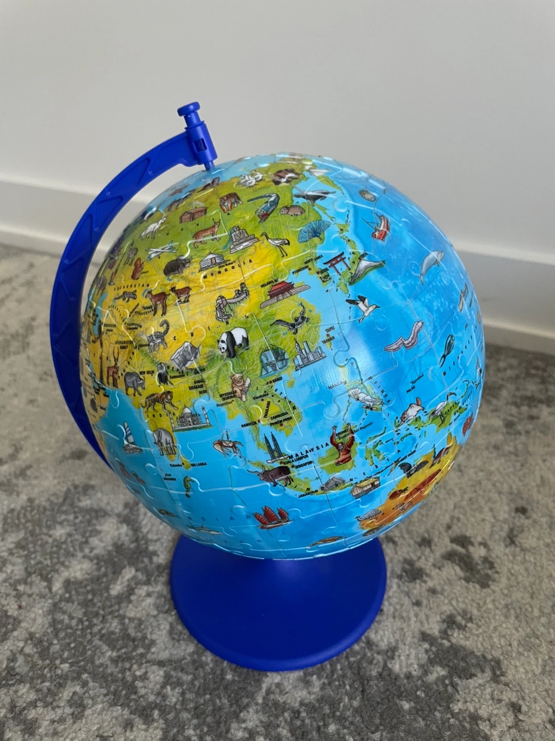 Assembled globe puzzle. Features animals and landmarks. Blue plastic stand. Rotating globe. Excellent condition