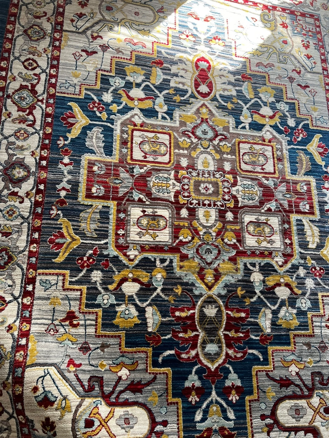 Beautiful area rug. Features a richly coloured, detailed pattern. Machine made. Excellent for adding warmth and style to a room.