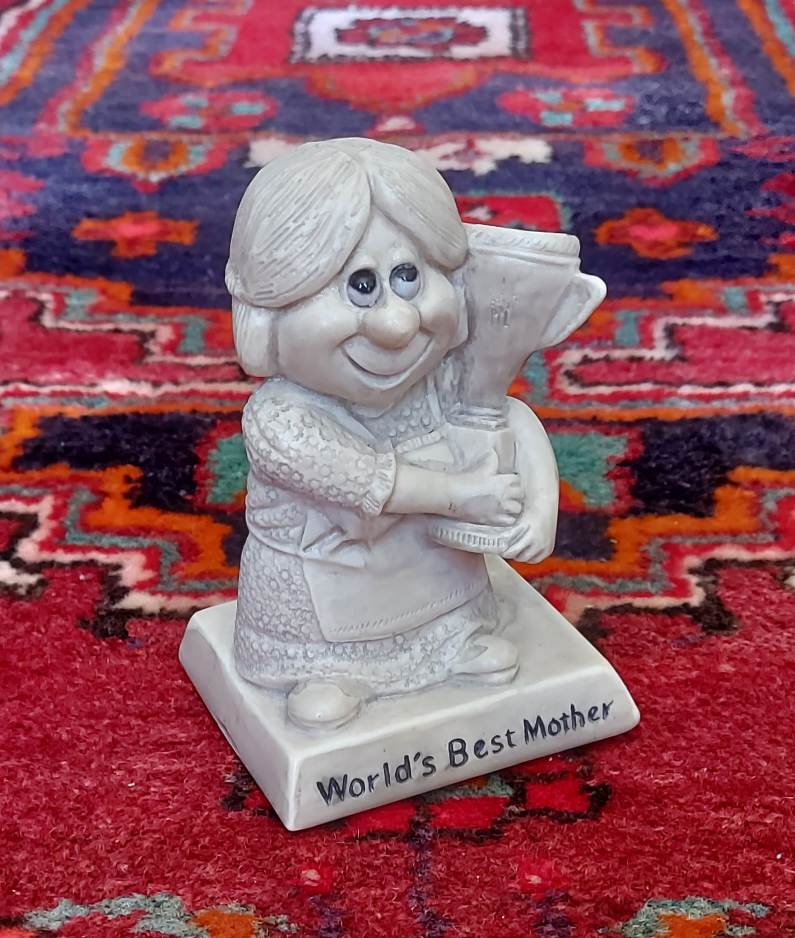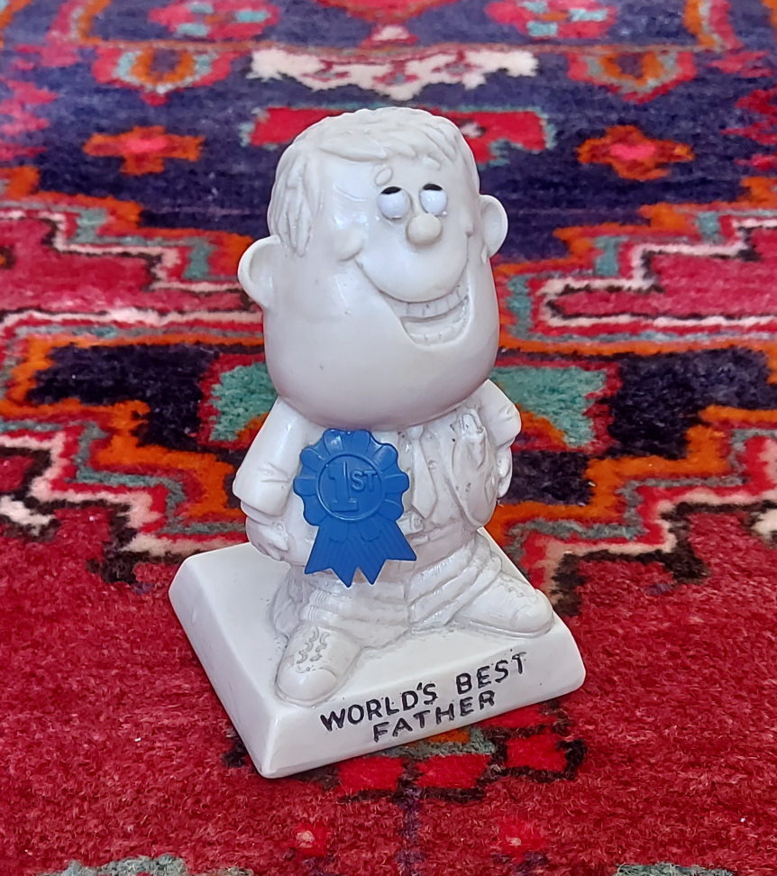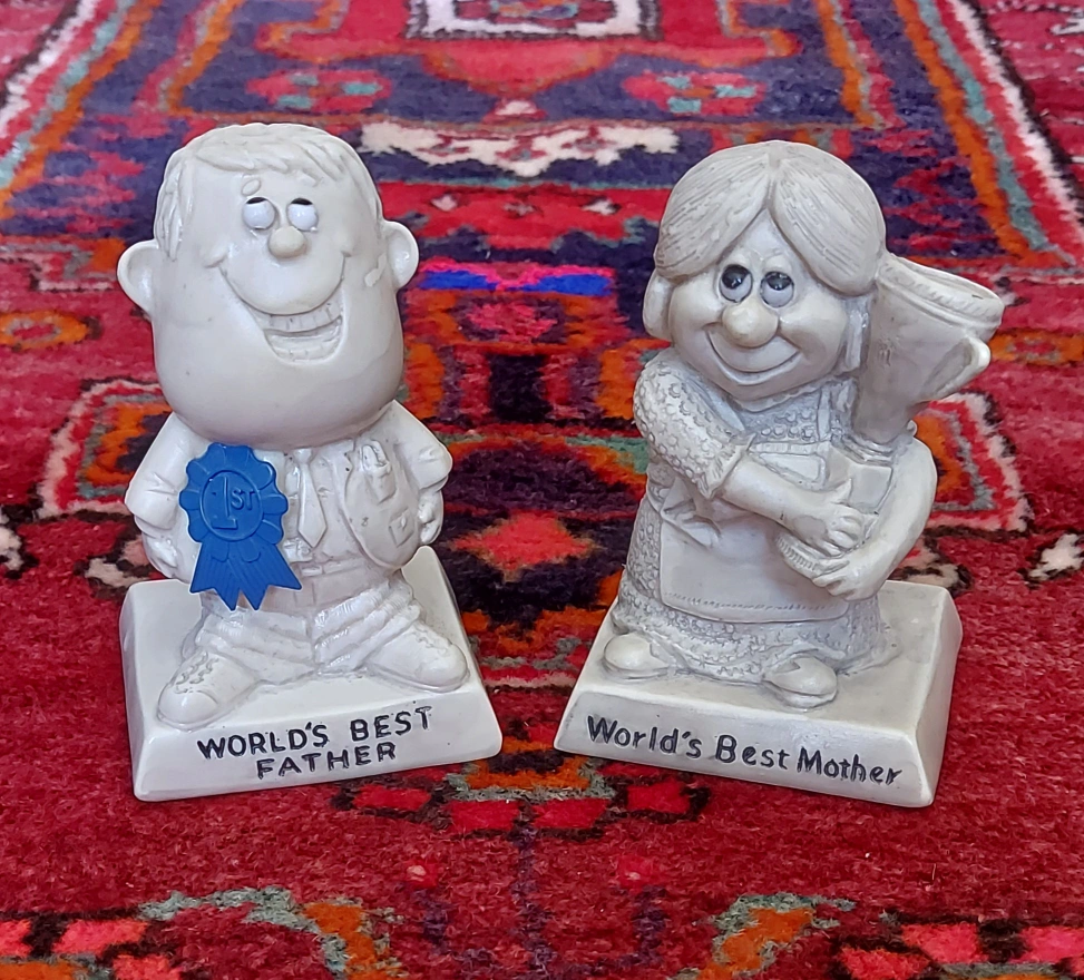 Pair of vintage figurines. One says "World's Best Father" and shows a man with a blue ribbon. The other says "World's Best Mother" and shows a woman holding a trophy. Collectible novelty items.