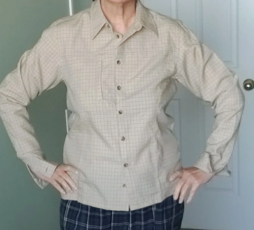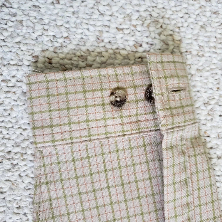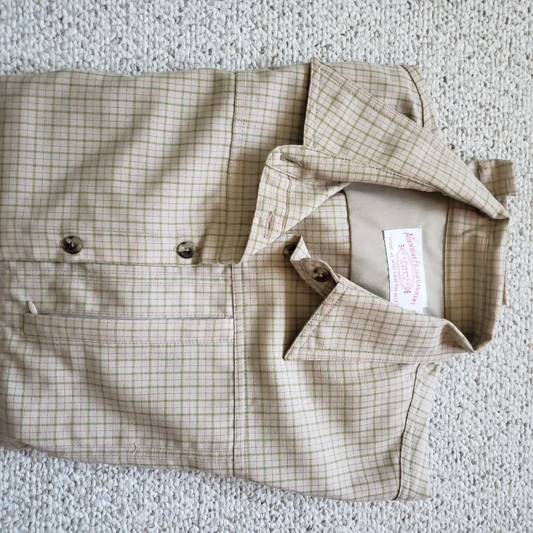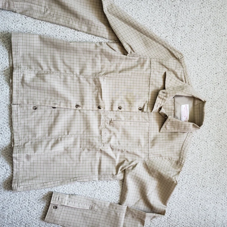 Long-sleeve button-down shirt. Beige and green plaid pattern. Vintage from 90. Never worn. Excelent condition. 100%wool fabric.