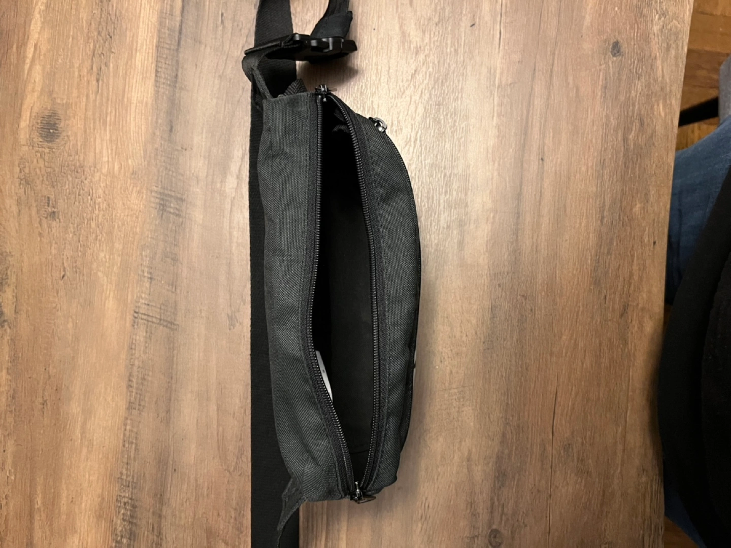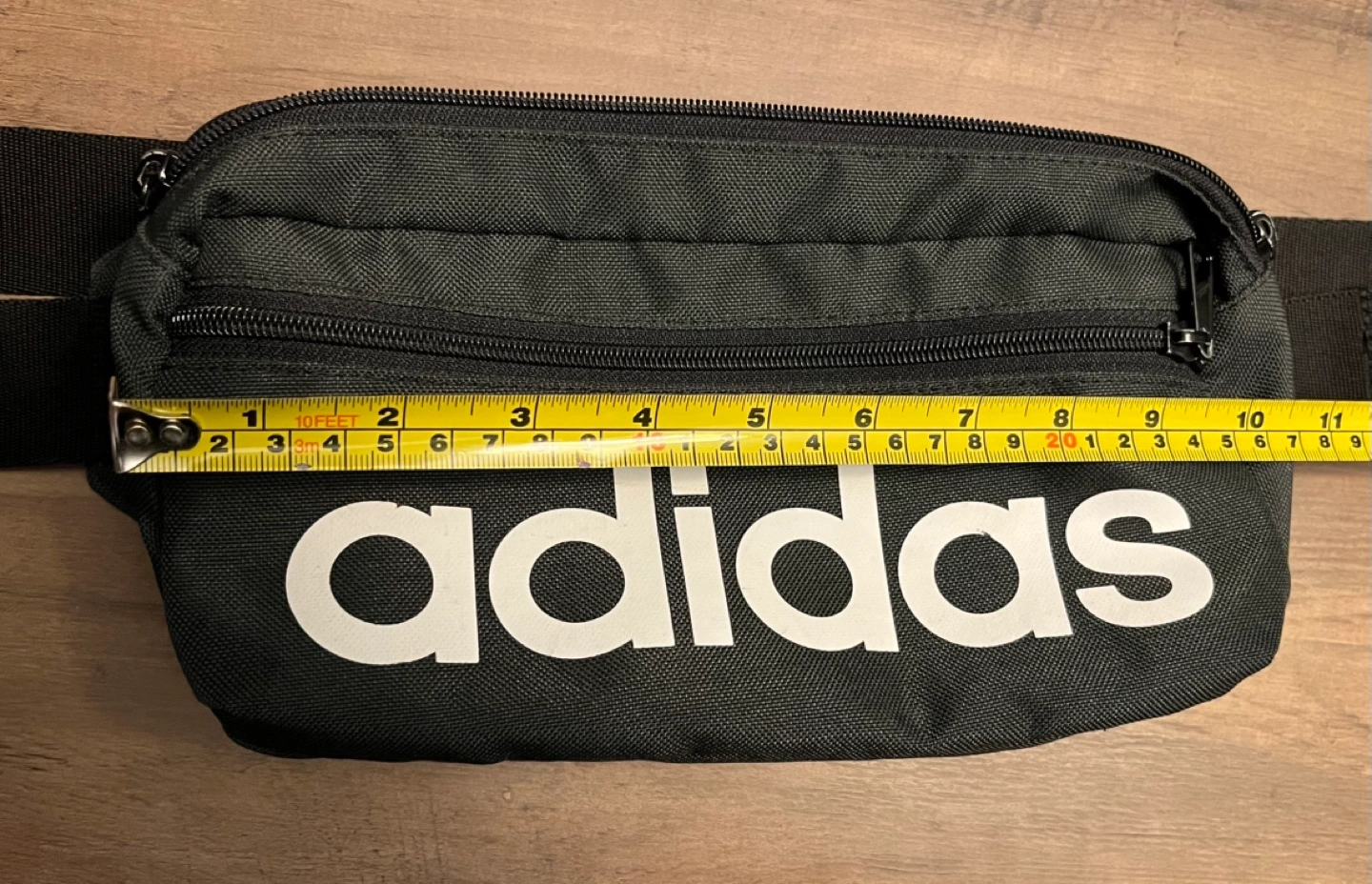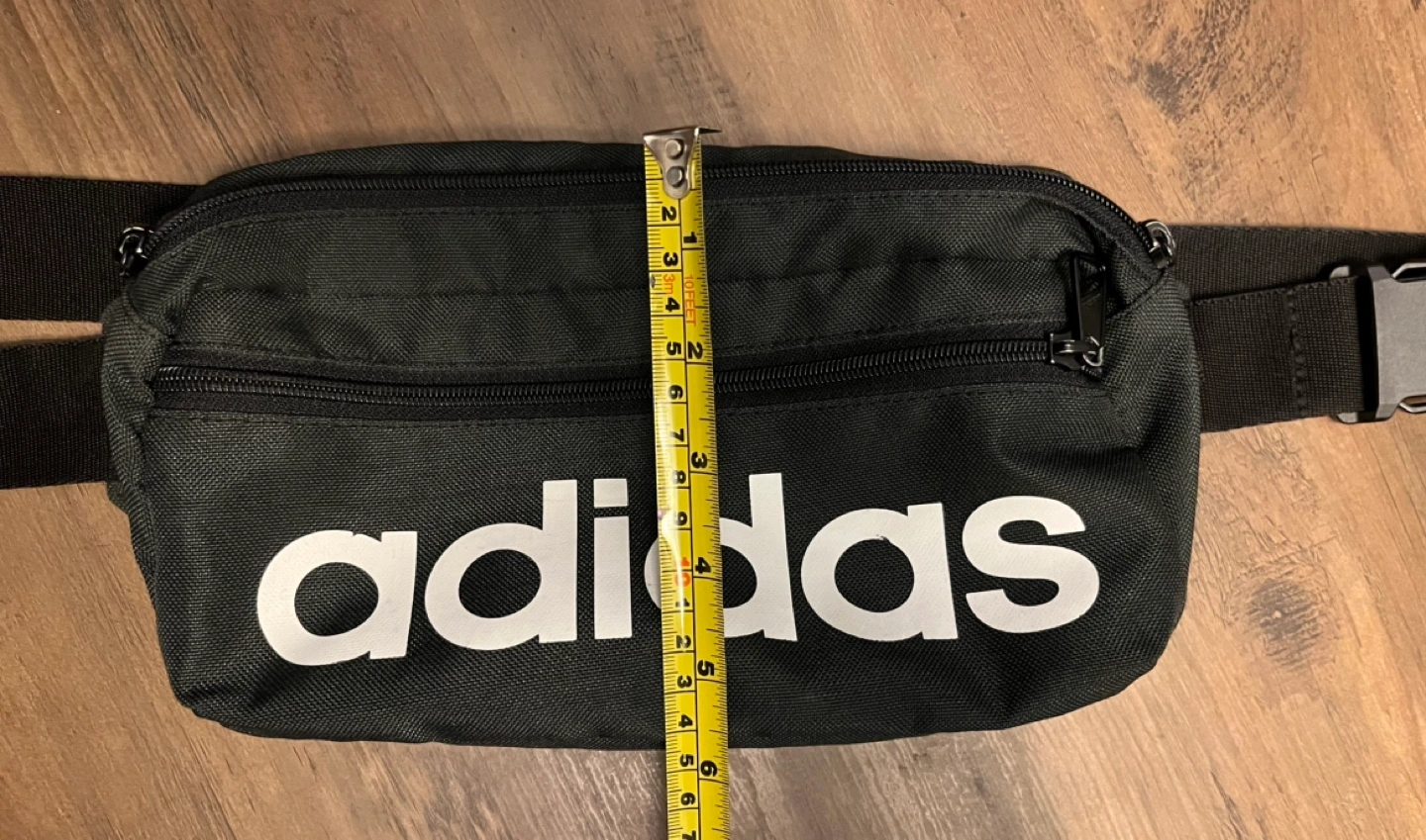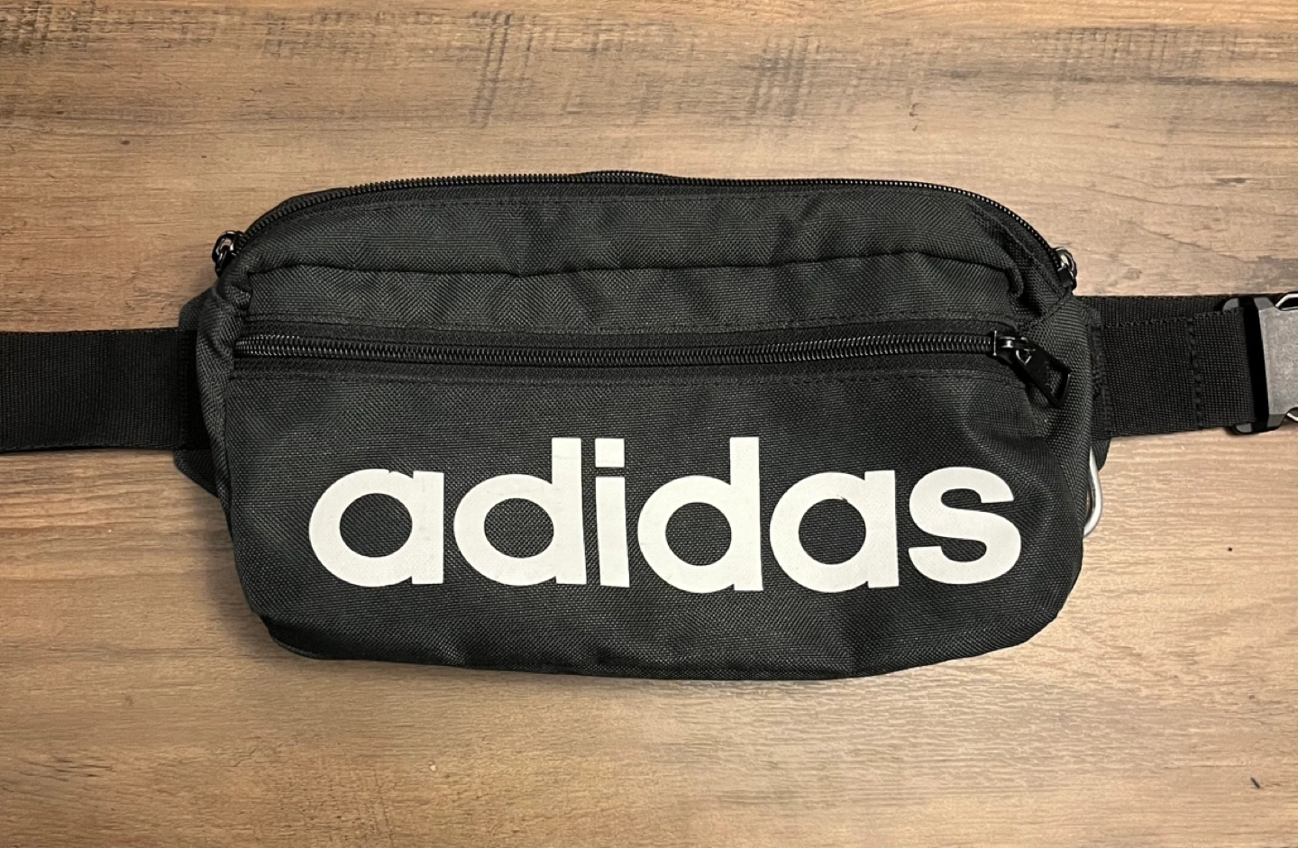 Black Adidas waist bag. Features adjustable strap and multiple zippered compartments. Perfect for everyday use or travel.