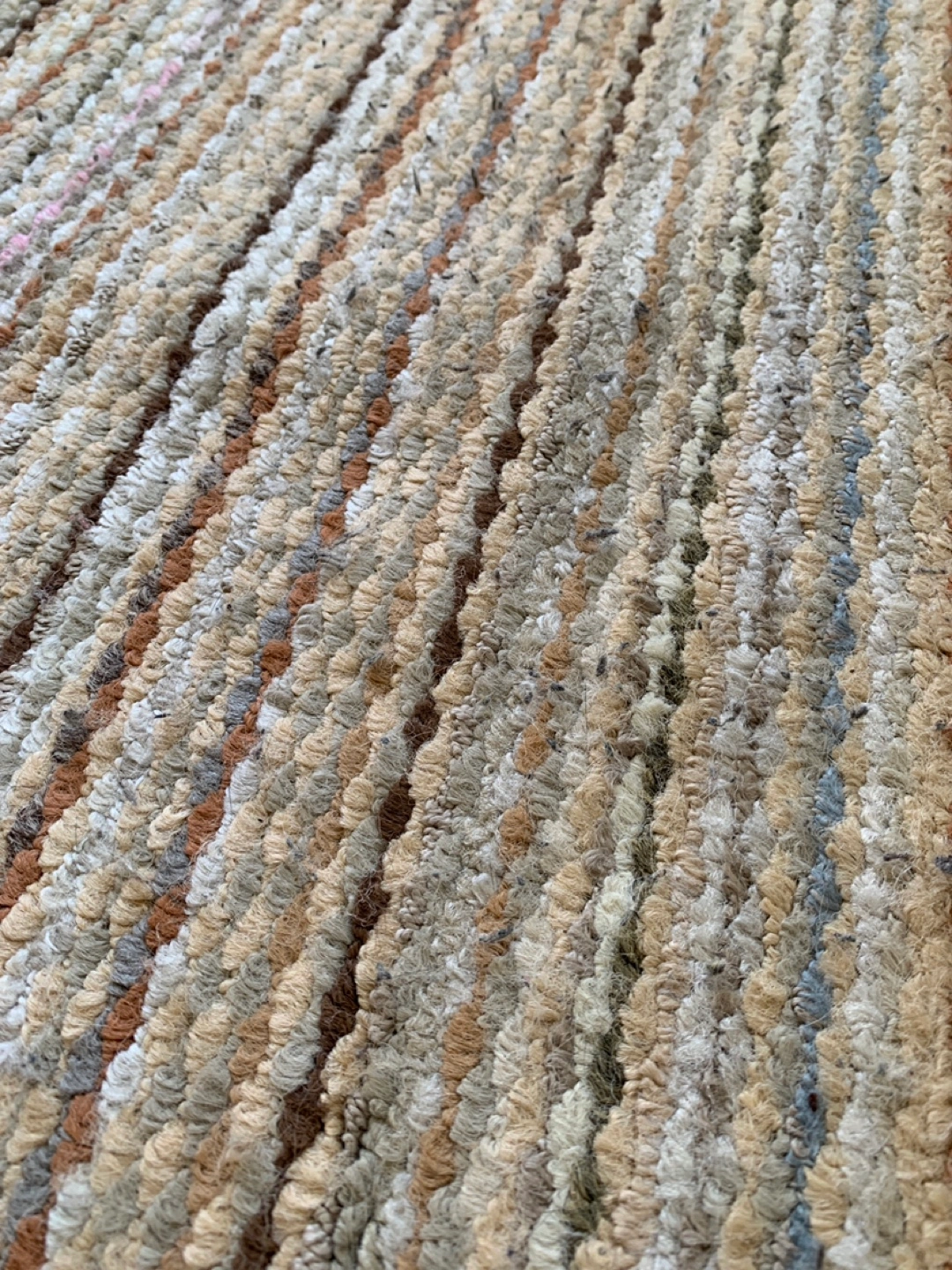Neutral coloured area rug. Features thin, vertical stripes. Non-slip backing. Used, I got it for two years. Smoke free Can have some cat hair left