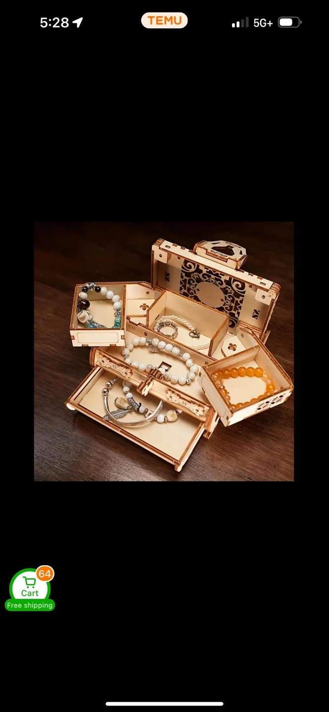 Intricate wooden jewelry box. Five compartments plus a drawer. Assembled 3D puzzle. Perfect for organizing jewelry or small trinkets. Unique design.