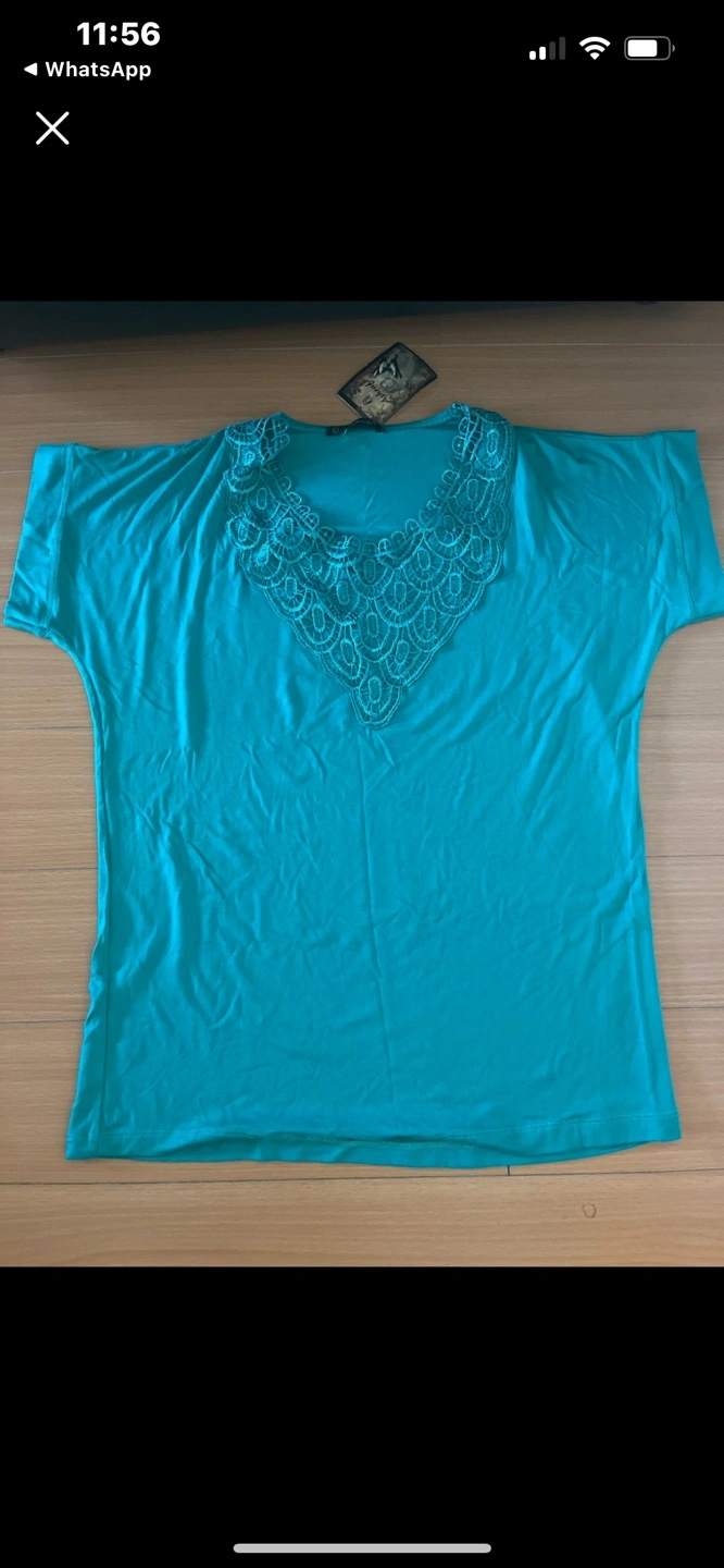 Women's short sleeve shirt. Teal colour. Features a lace neckline. Lightweight and comfortable material.