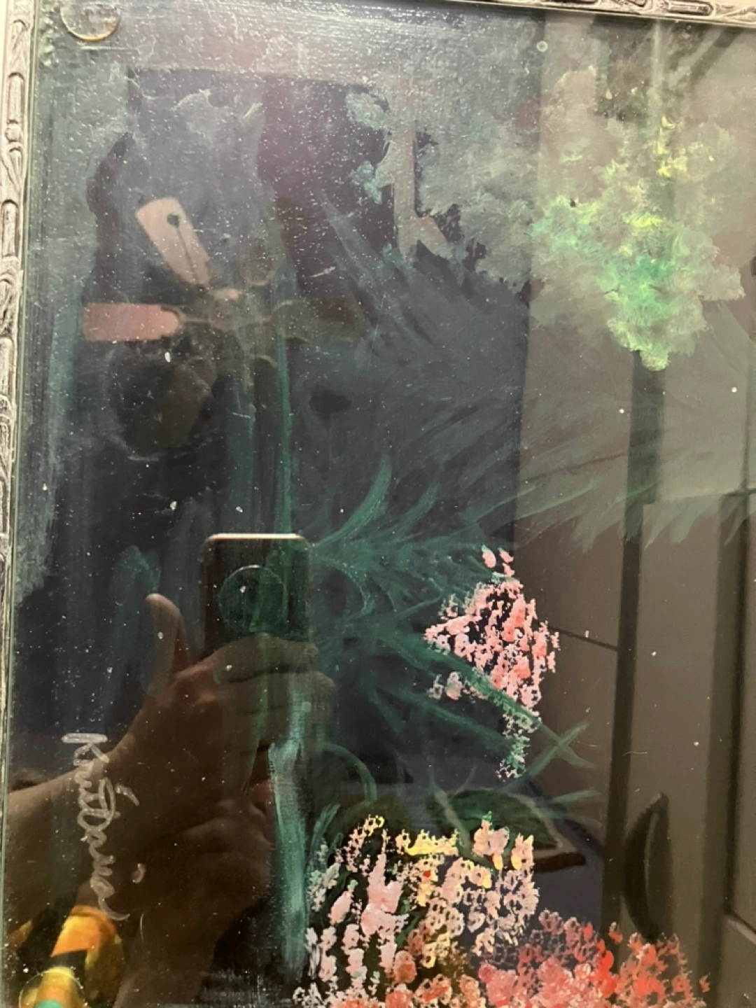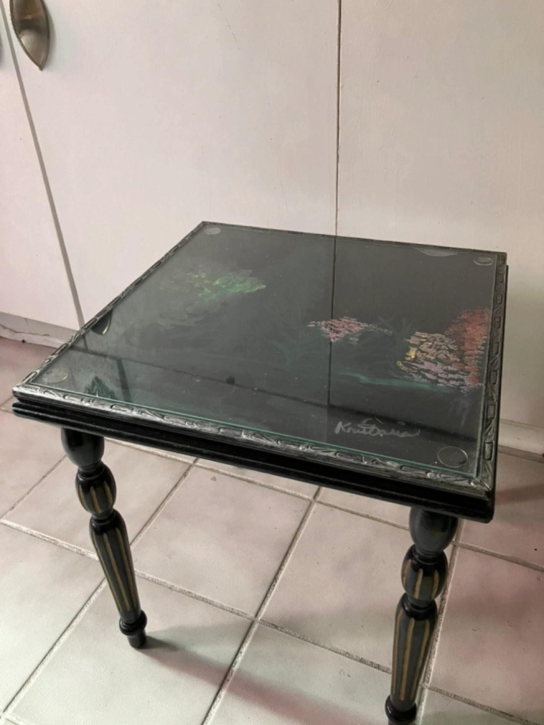 Square glass top side table. Wood, Black frame with decorative detailing. One of a kind, Features an artist-signed floral painting under the glass. European design legs. Small size, perfect for a small space. Legs unscrew for easy transport , not too heavy can carry. Cash / pickup only 💚