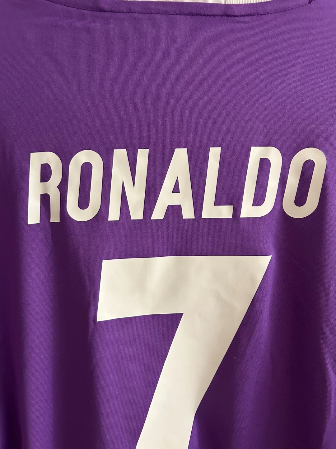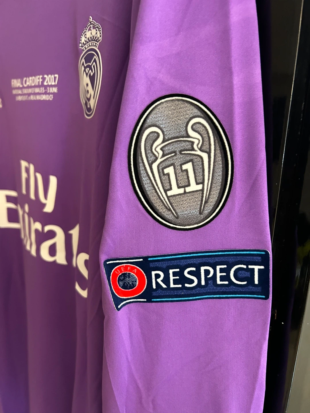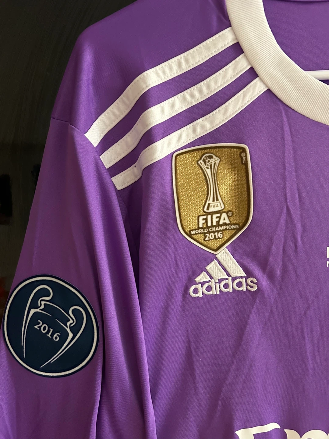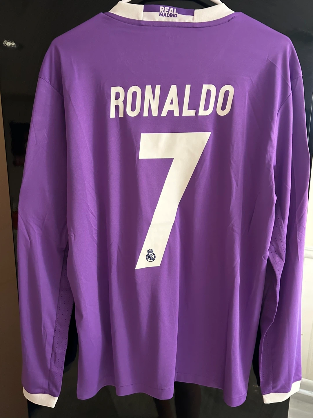 This is a Real Madrid long-sleeved soccer jersey from the 2017 Final Cardiff match. It features Ronaldo's name and number 7 on the back, along with the FIFA World Champions 2016 patch and UEFA Respect patch. The jersey is purple with white trim. It's made with climacool technology for breathability.