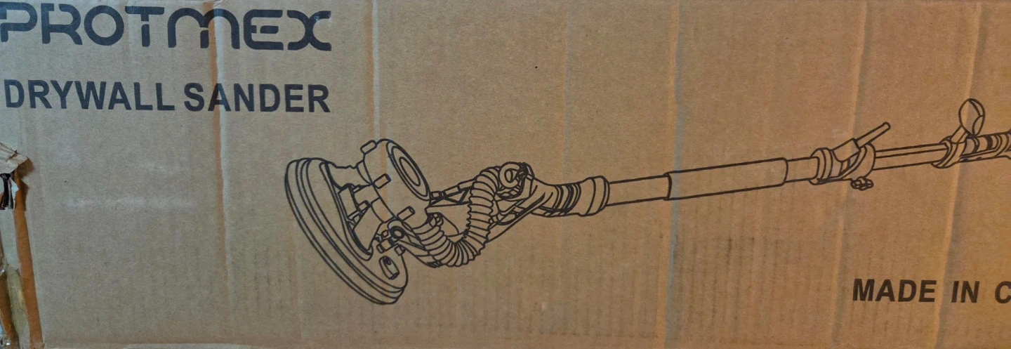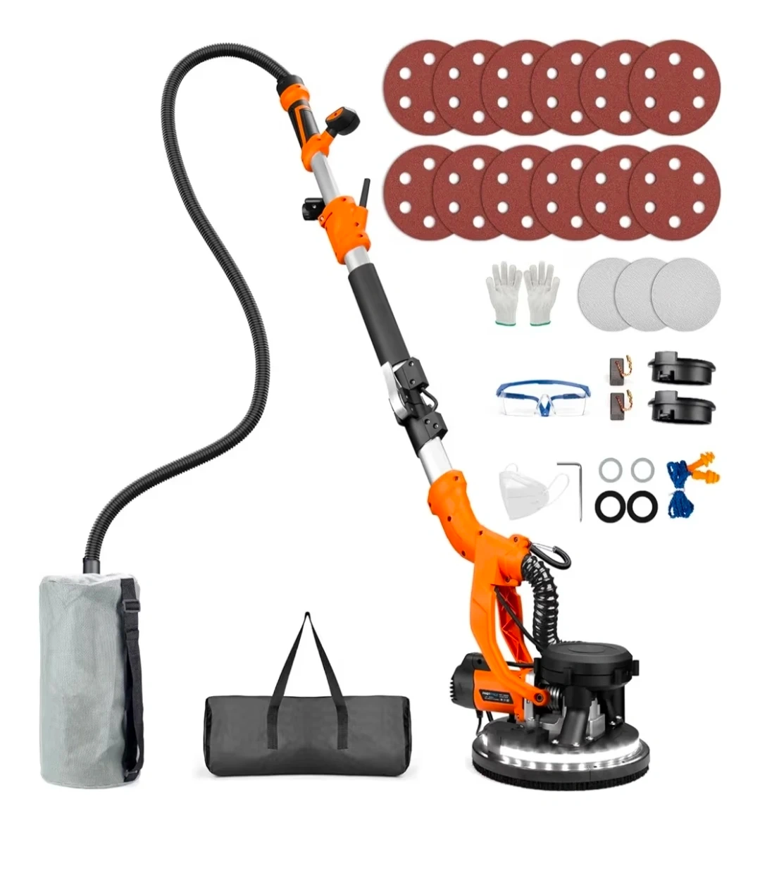 This PROTMEX drywall sander comes with a dust collection bag and a carrying bag. It includes sandpaper, gloves, safety glasses, and extra brushes. Great for finishing drywall projects!