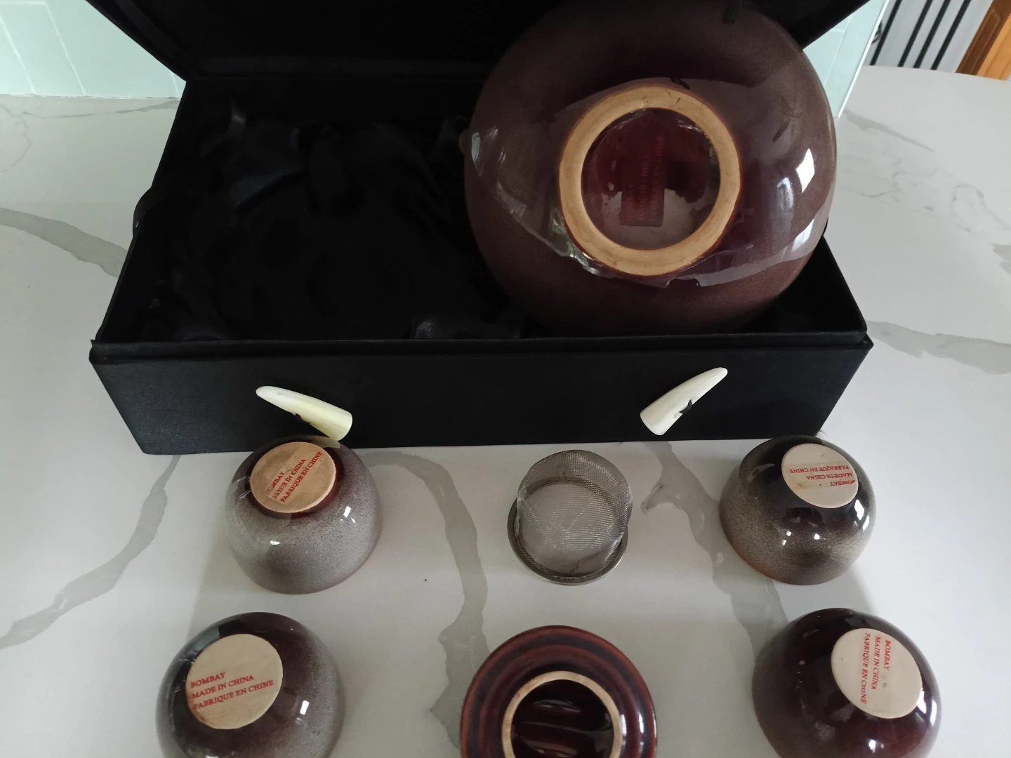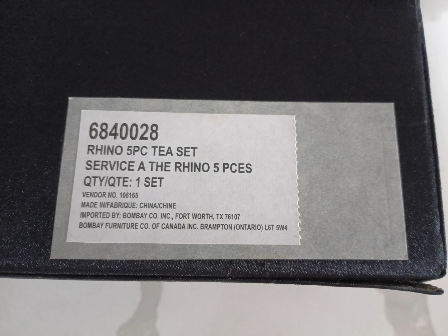 This is a Rhino 5-piece tea set, including one teapot and four cups. It comes with a metal tea strainer and is presented in a stylish black gift box. Made in China.