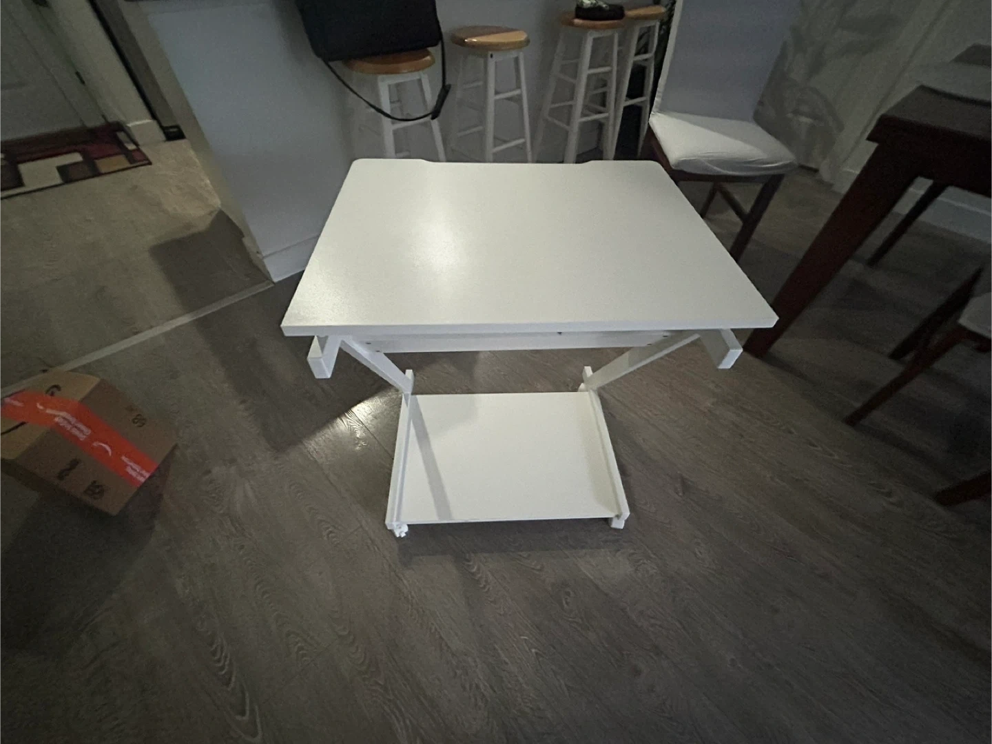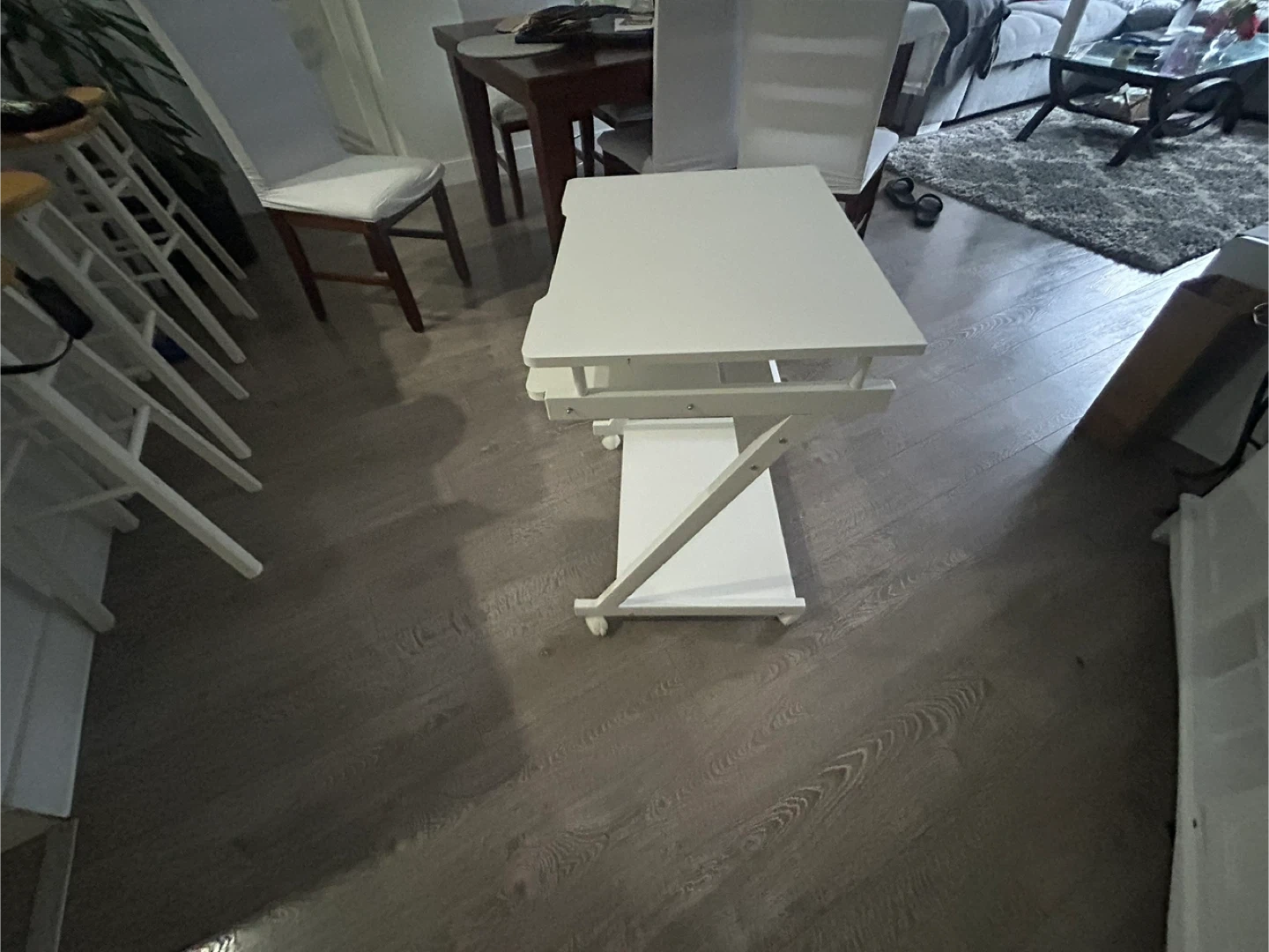 Soges movable desk with a keyboard tray and two shelves. It's white and has lockable wheels for easy movement. Perfect for a small workstation!