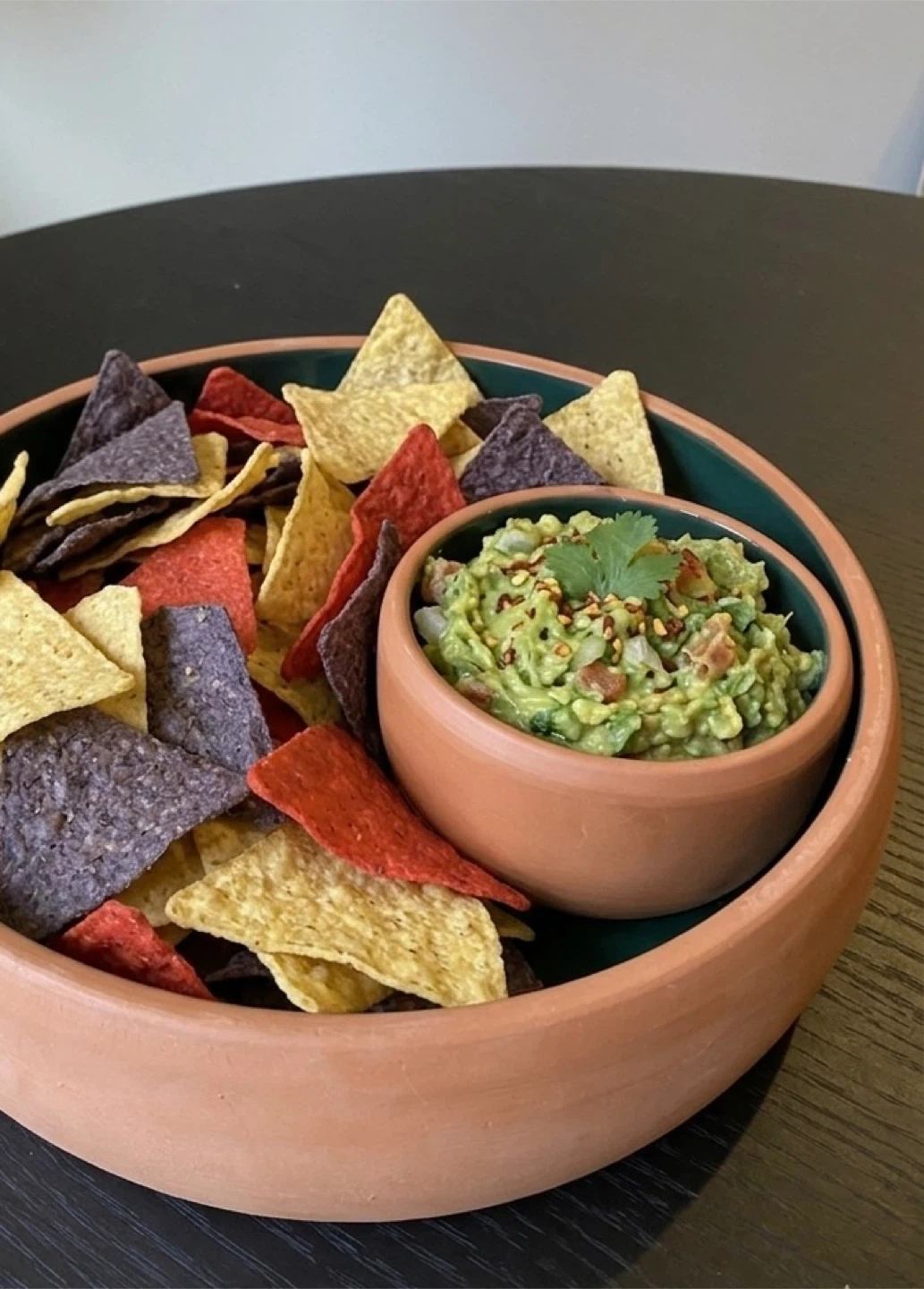 • Design: A minimalist, two-piece configuration including a large circular platter and a matching deep dip bowl.