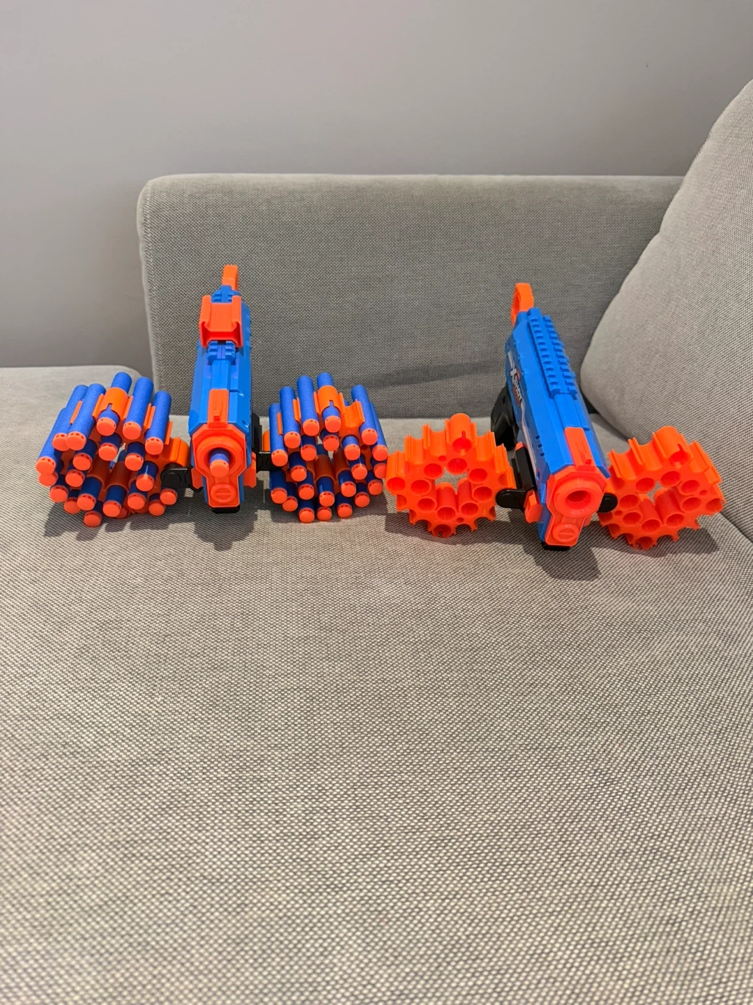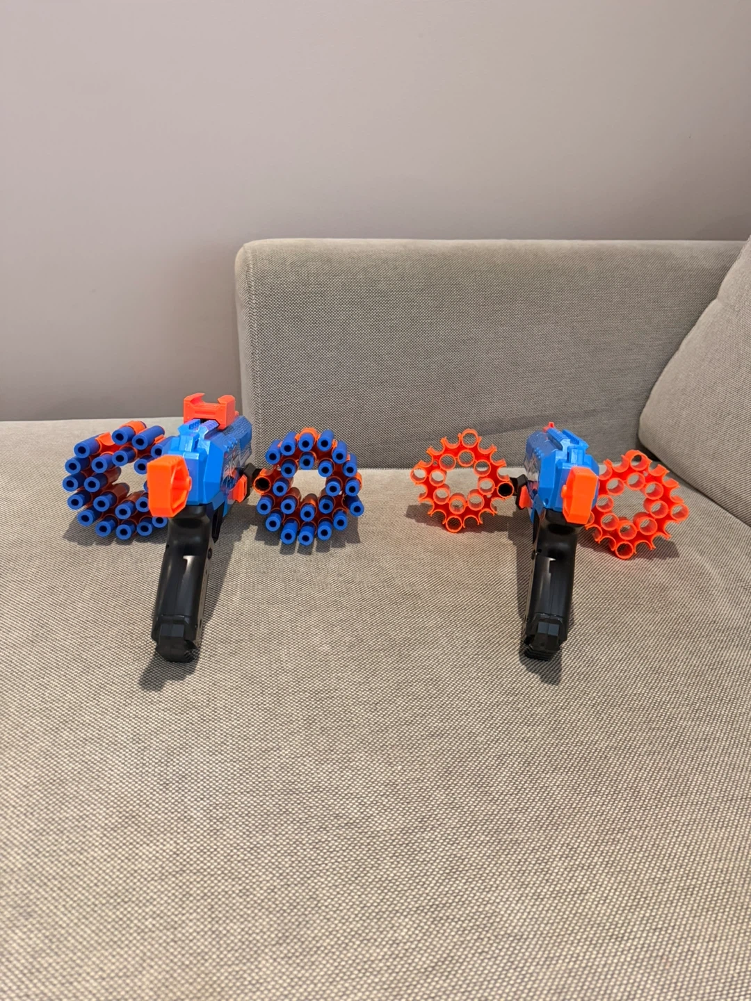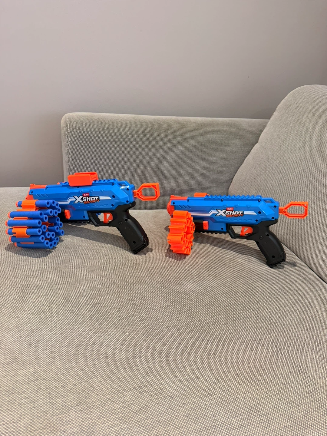Two blue and orange X-Shot toy blasters included. Each blaster comes with two detachable dart drums. Plenty of fun for imaginative play!