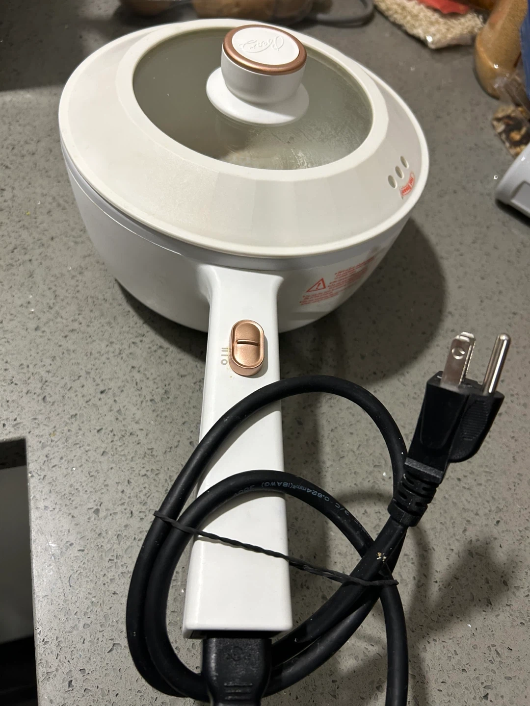 A white electric cooking pot with a transparent lid. It's a versatile kitchen appliance for various cooking needs. The pot has a non-stick interior and a simple control switch. It includes its power cord.