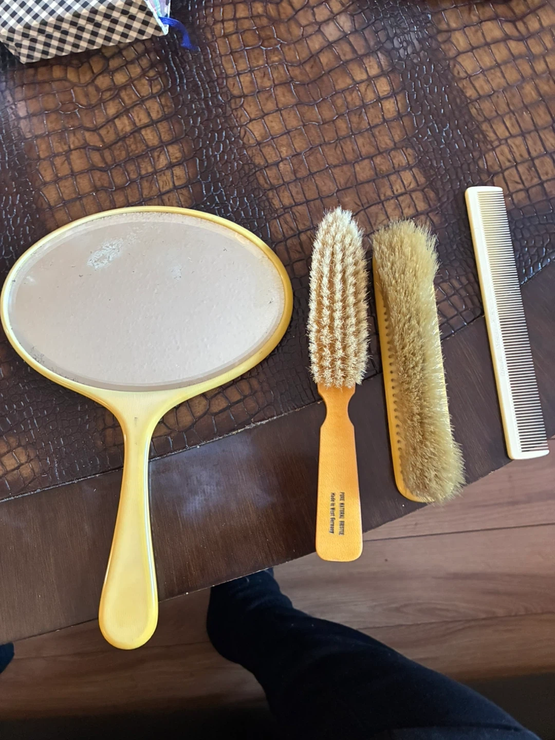A lovely vintage vanity set with a hand mirror and two brushes, plus a comb. The handle on one brush indicates 'Pure Natural Bristle' and 'Made in West Germany'. This set is perfect for someone who appreciates classic grooming tools.