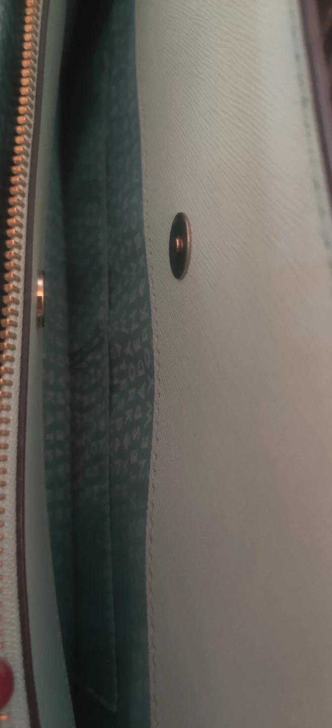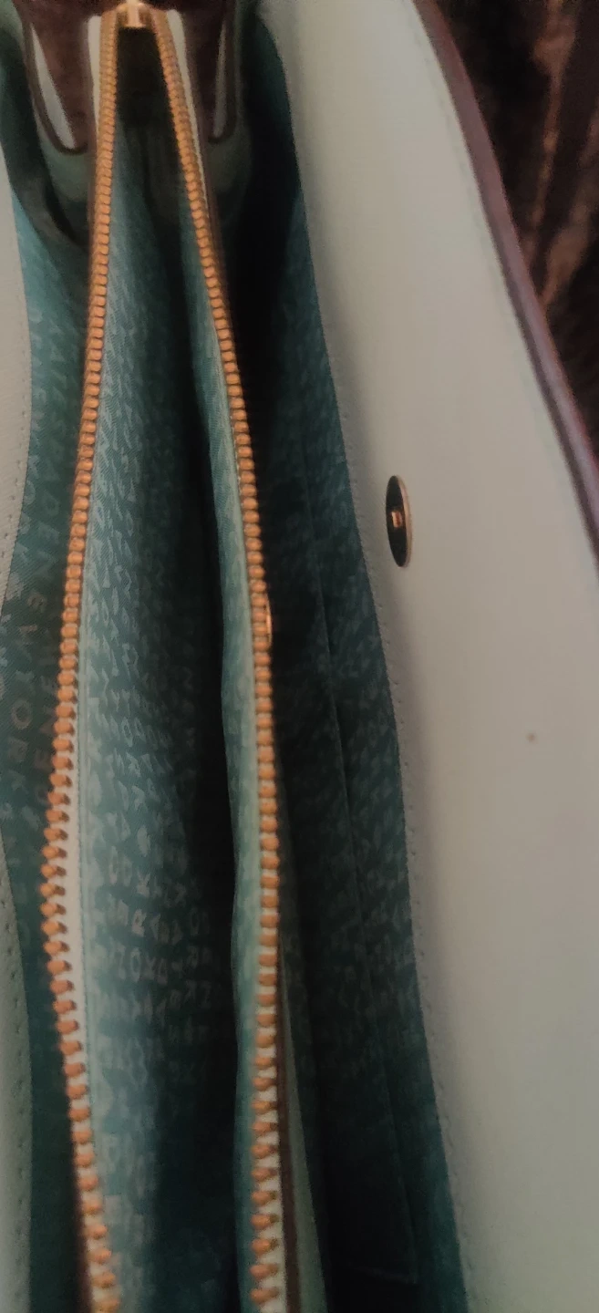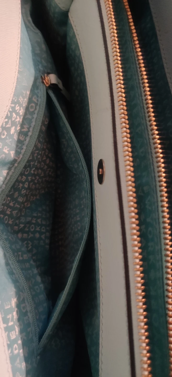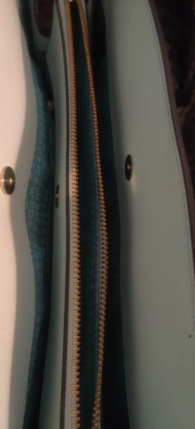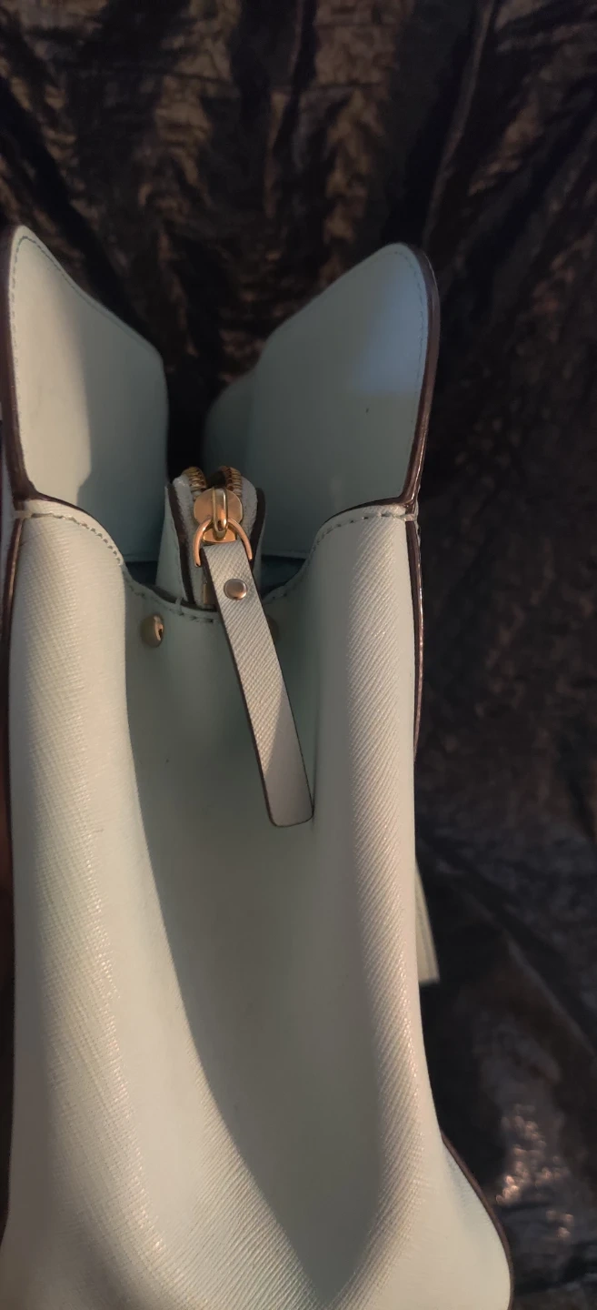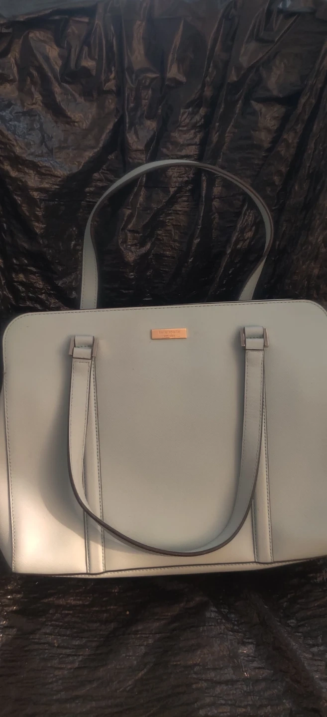 This is a light blue large size bag by Kate Spade New York. It features a zip-top closure and multiple interior pockets. The interior lining has the brand's signature spade pattern. 3 seperate compartments. Please look at pics. Bag is preowned so minor wear and stains should be expected.
