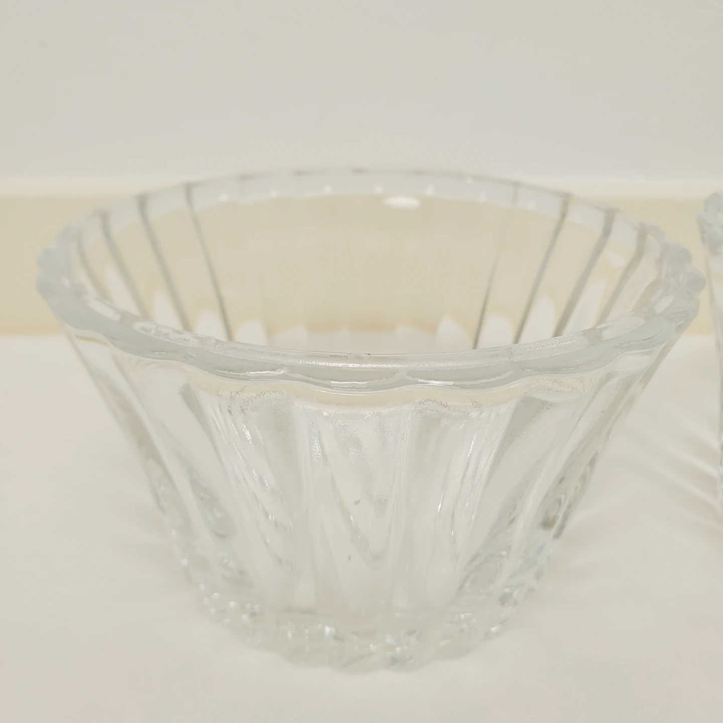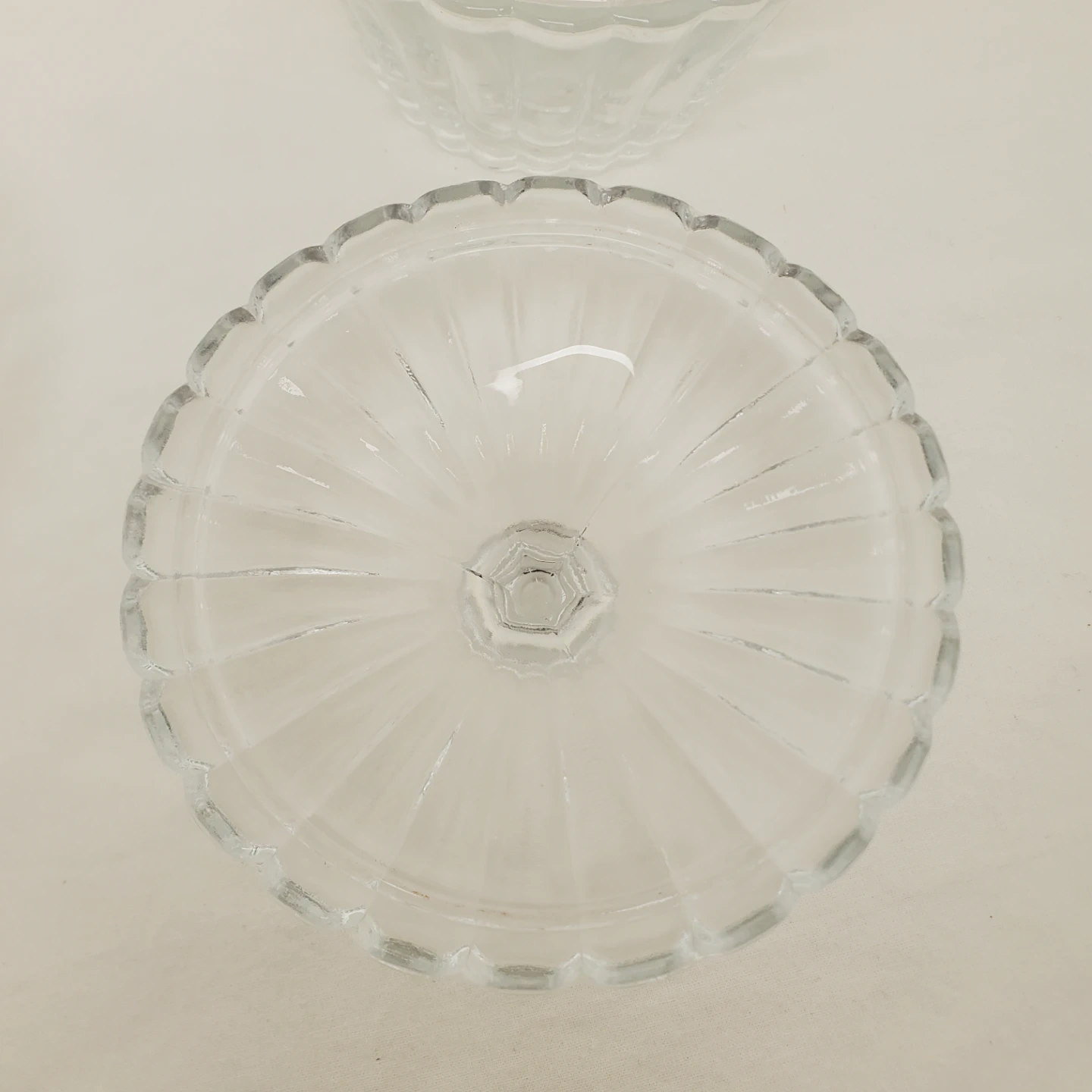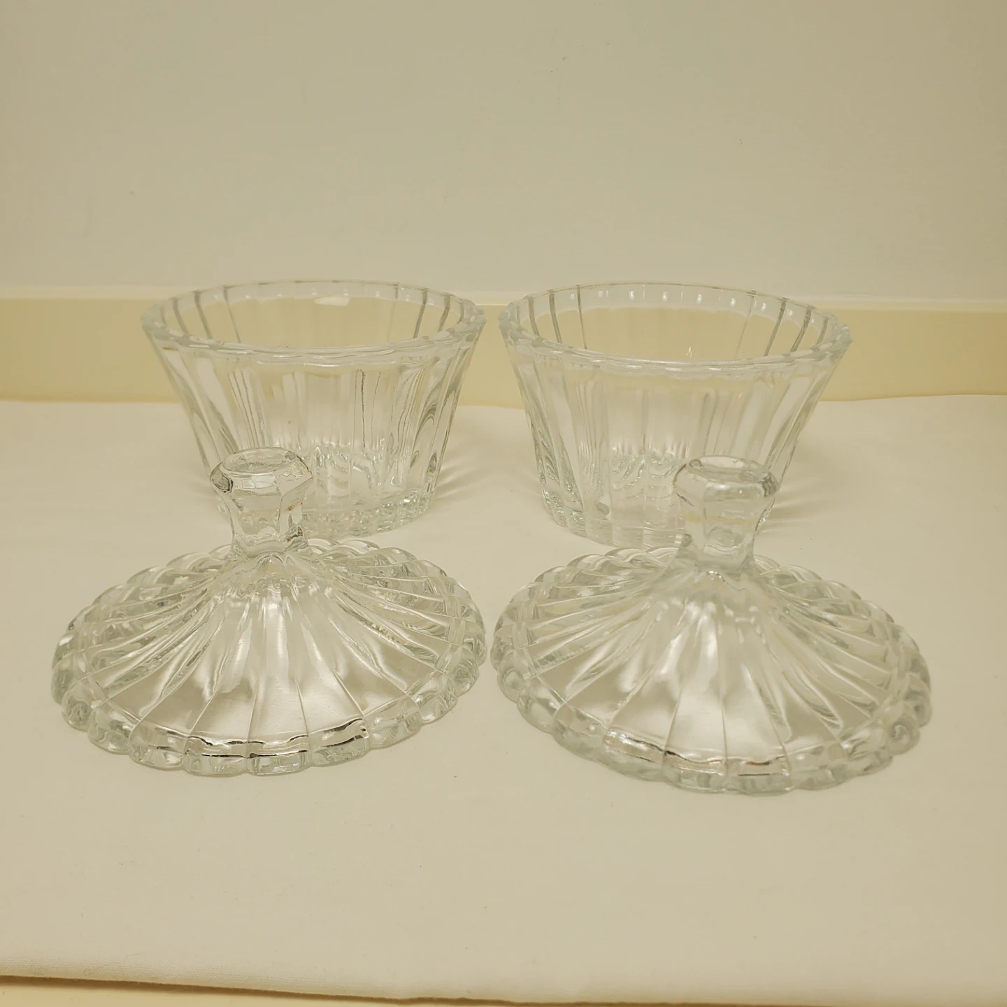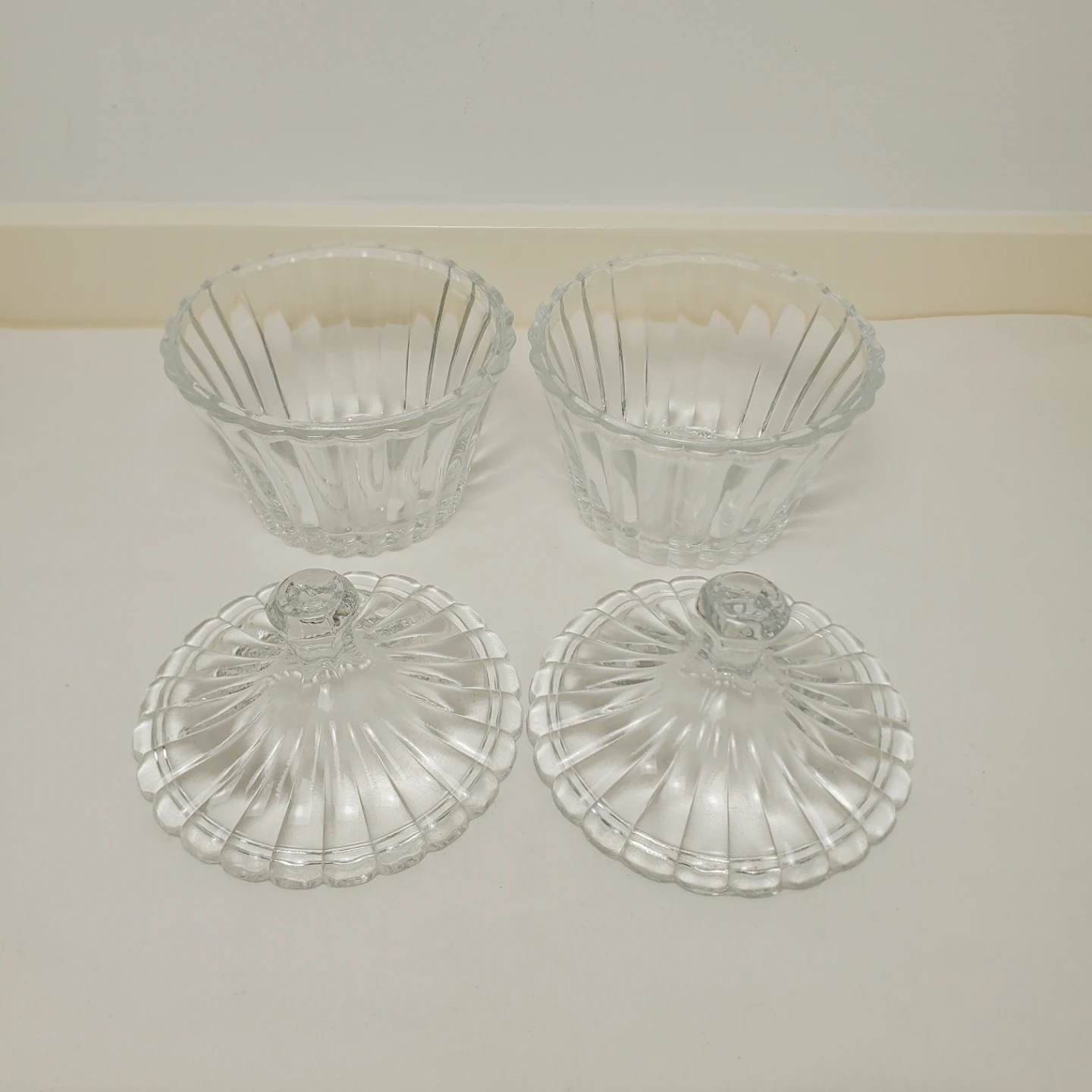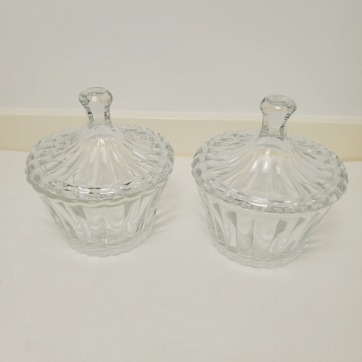 These are two clear glass candy dishes, each with a matching lid. They're perfect for serving sweets or small snacks. Glass material. Has small chips on the inside rim. In over all good condition.