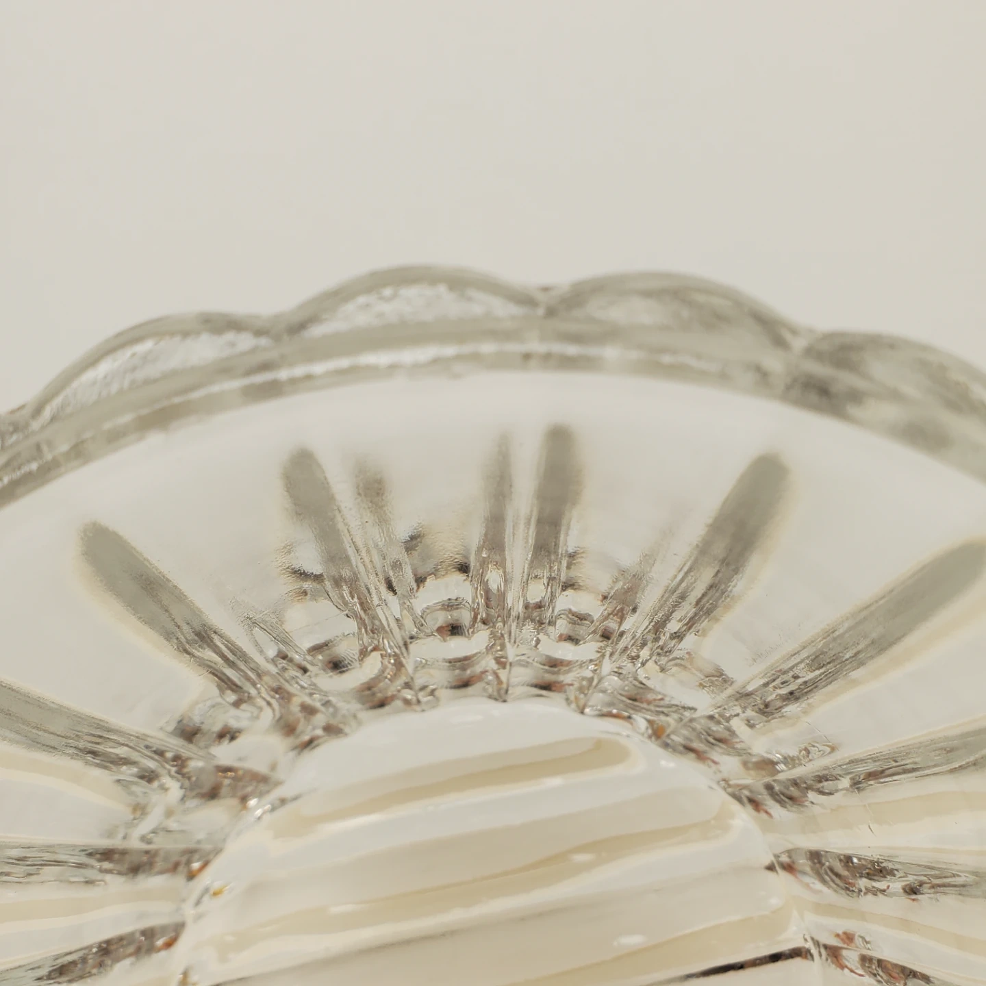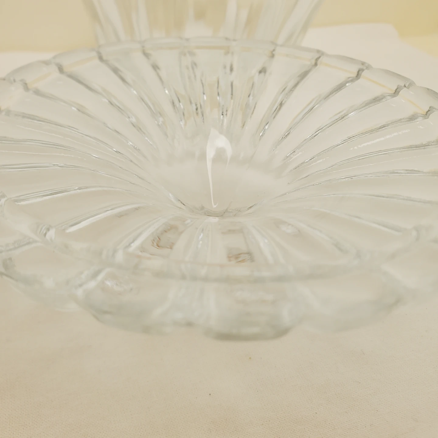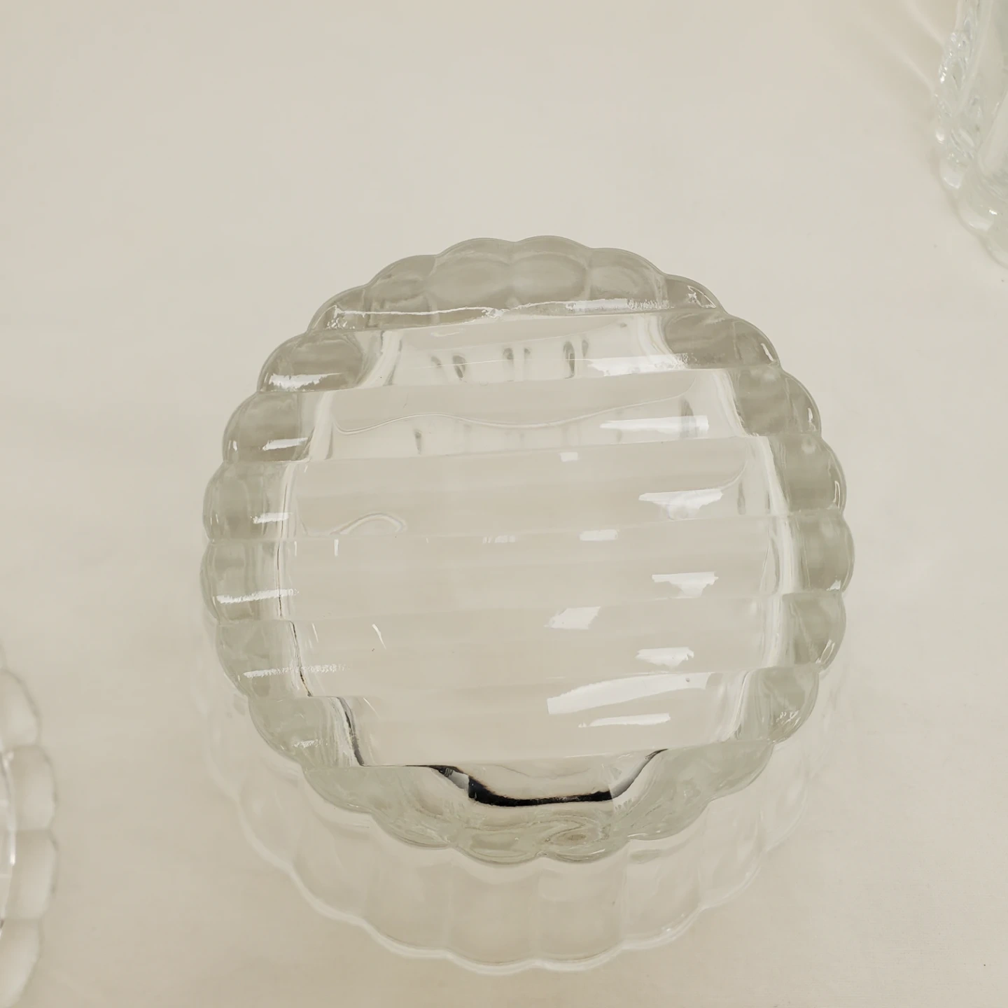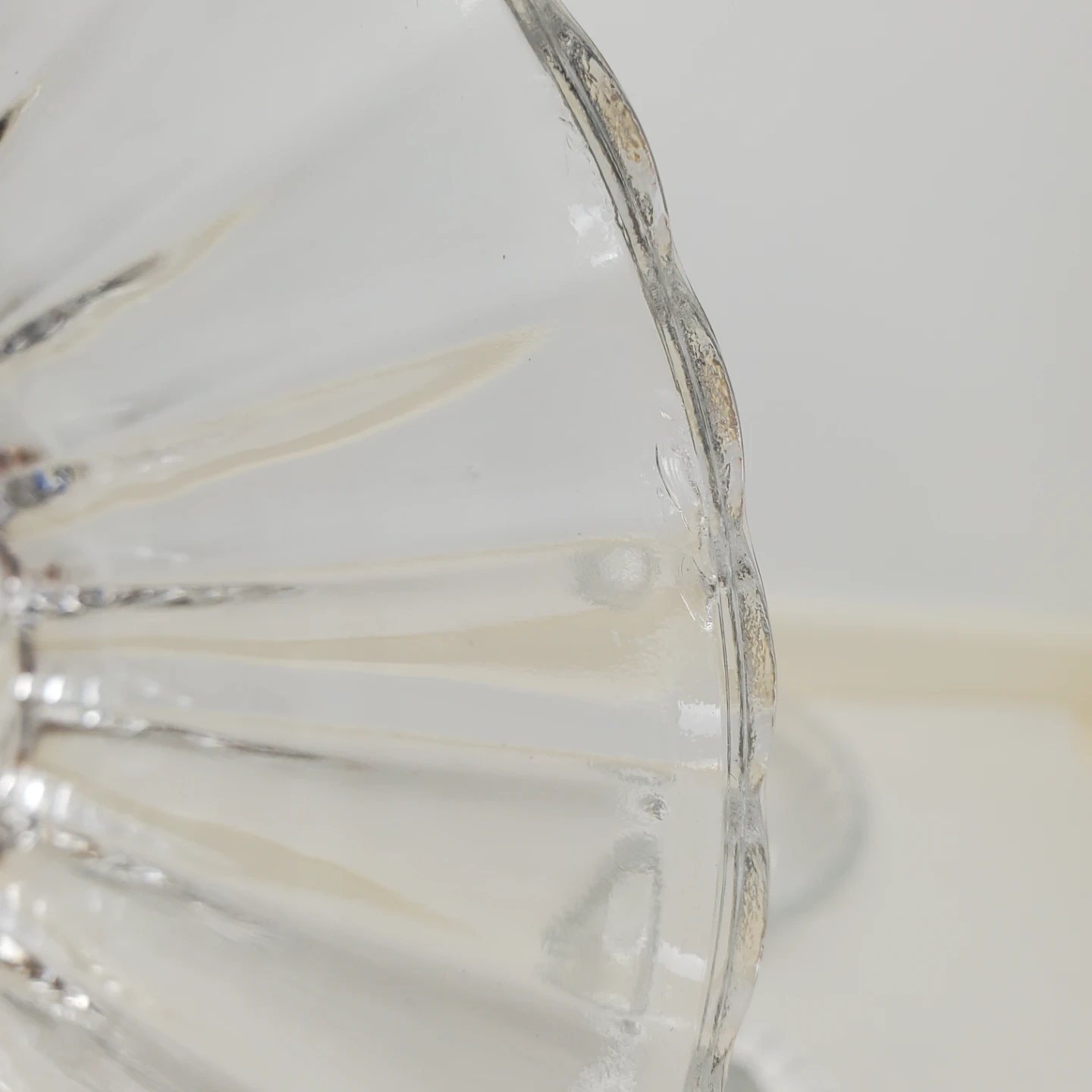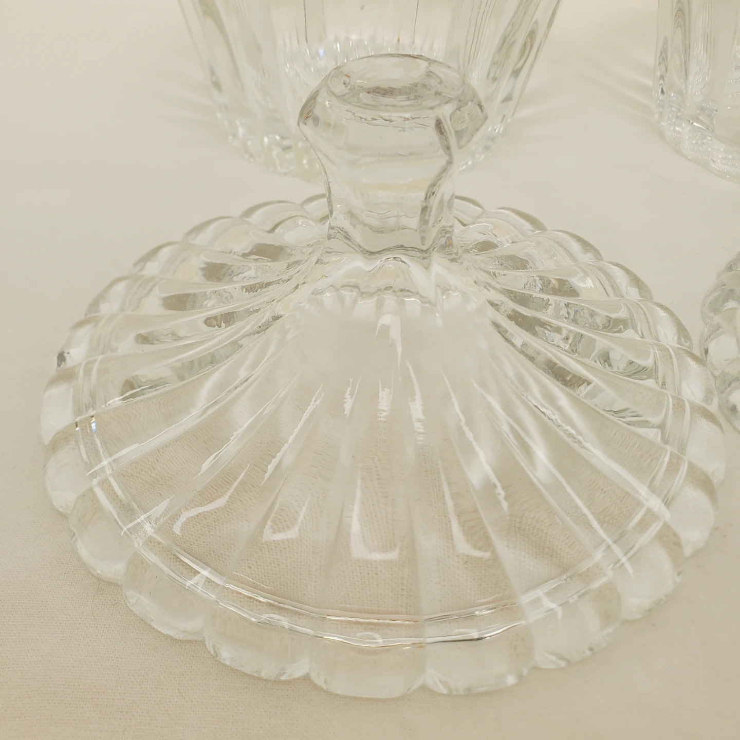 These are two clear glass candy dishes, each with a matching lid. They're perfect for serving sweets or small snacks. Glass material. Has small chips on the inside rim. In over all good condition.