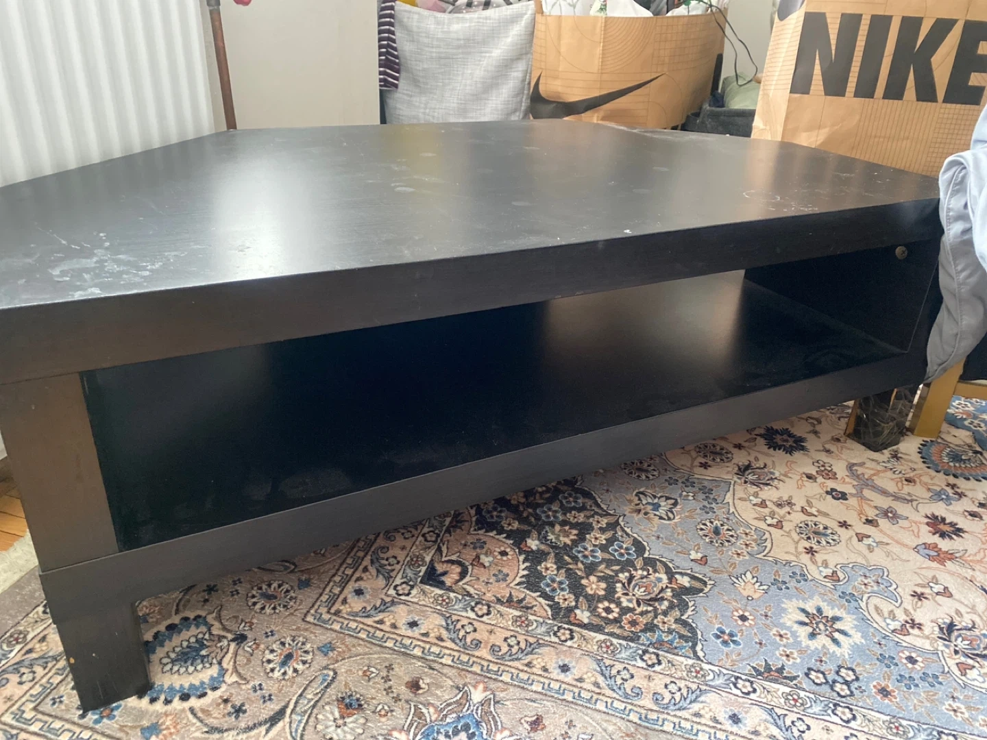 This is a black tv stand with a convenient lower shelf for storage. It's made of wood and has a modern, simple design. It's a good size for most living rooms. And rooms it has a sectional side so you can put in the corner