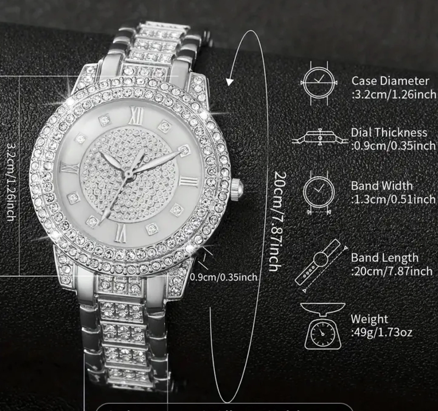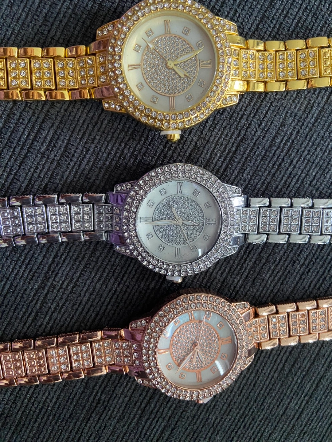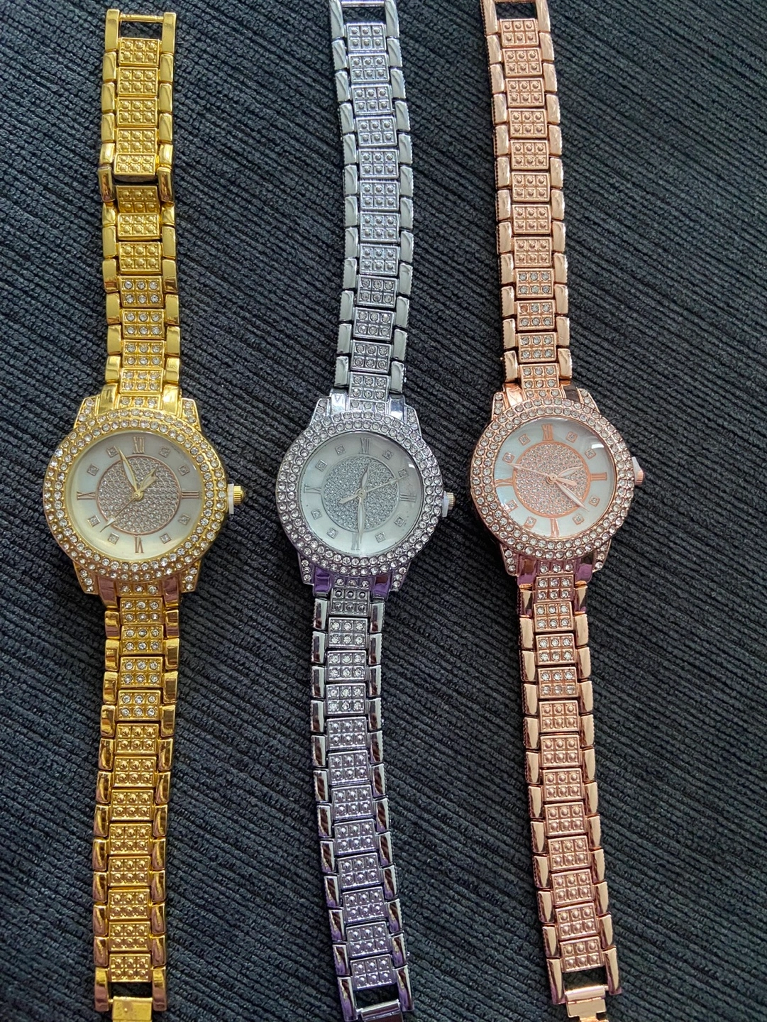 Gorgeous sparkly watch. Features a rhinestone-encrusted band and face. Available in silver, gold, and rose gold. Quartz movement. Elegant and eye-catching.