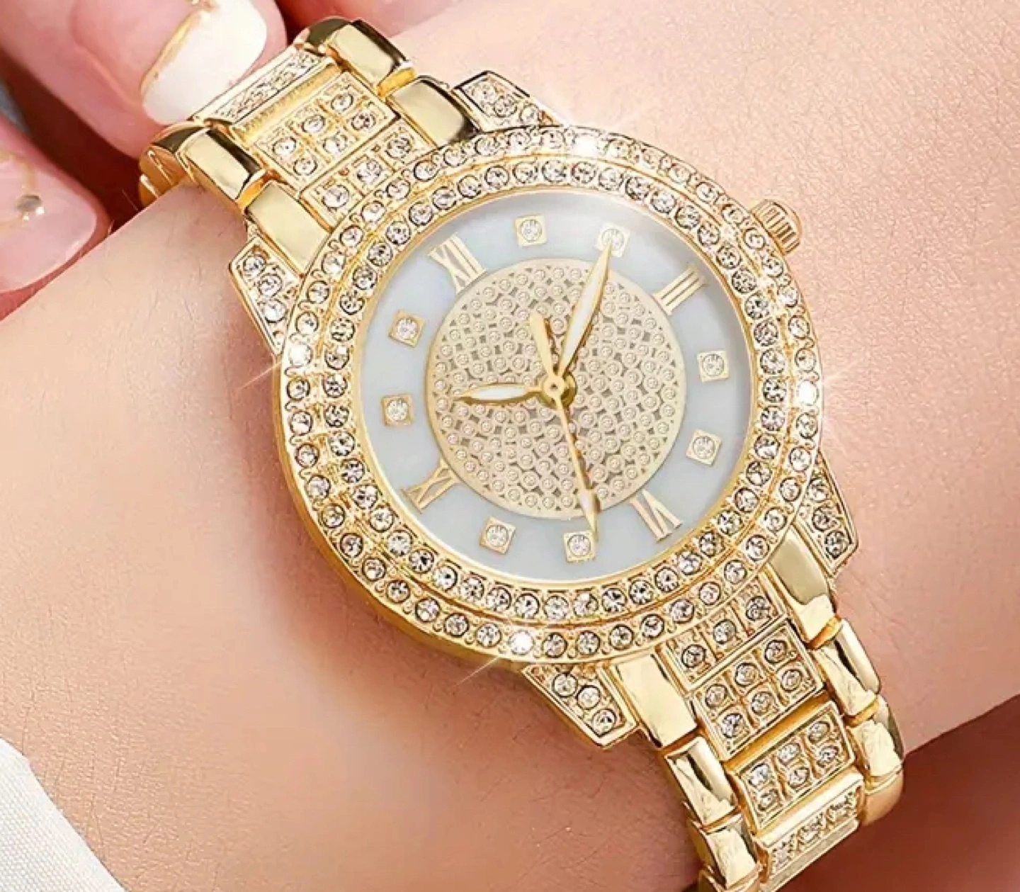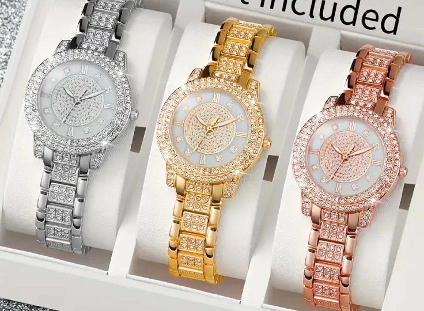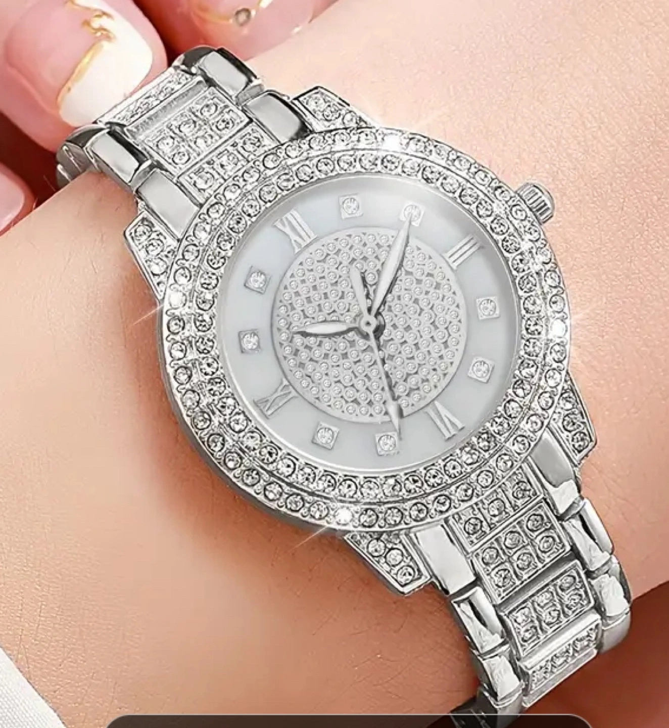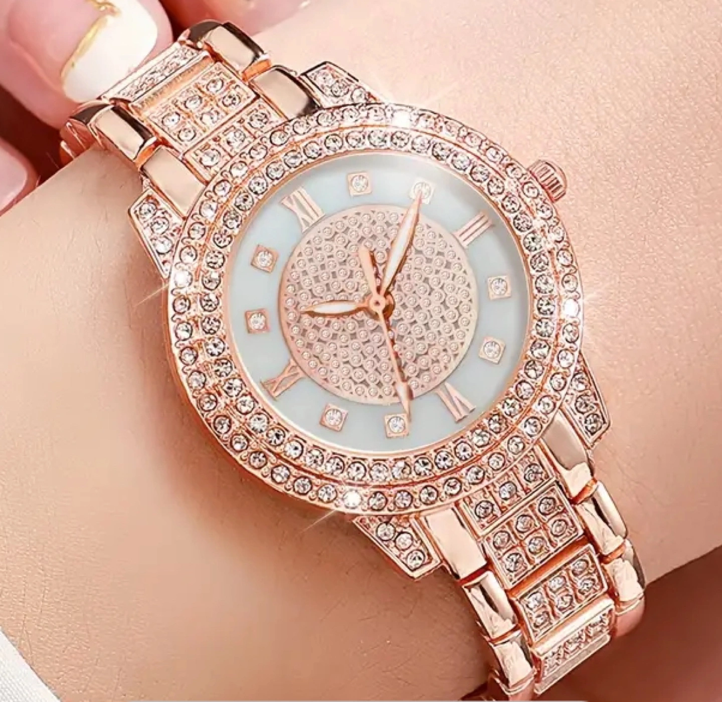 Gorgeous sparkly watch. Features a rhinestone-encrusted band and face. Available in silver, gold, and rose gold. Quartz movement. Elegant and eye-catching.