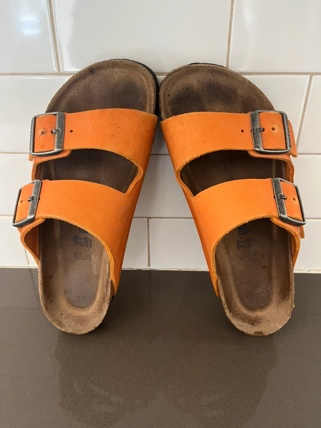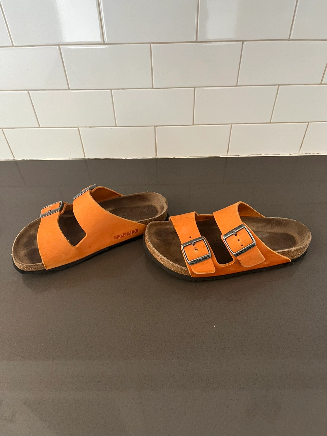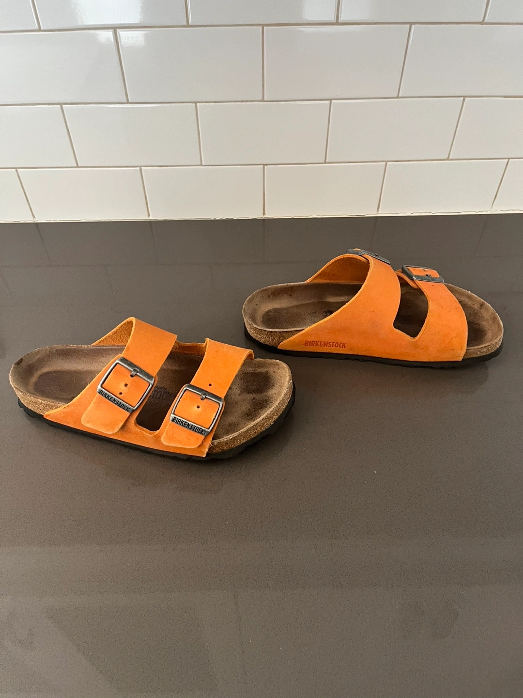 41Pre-owned Birkenstock Arizona sandals. Orange suede straps. Cork footbed. Double buckle design. Good used condition. Awesome colour for spring and summer! Regular width. Size 37 EU, women’s size 6-6.5. Pick up in Utopia