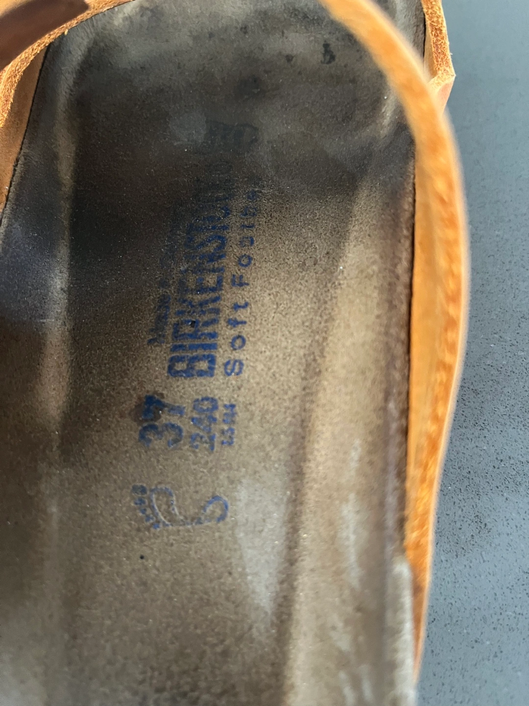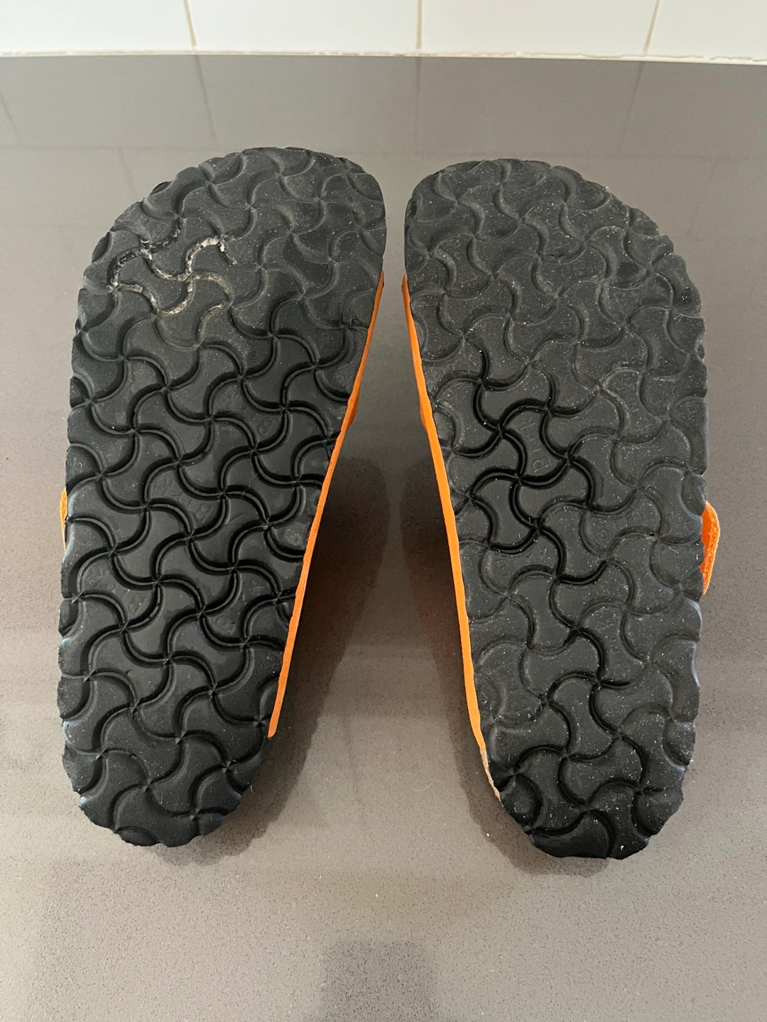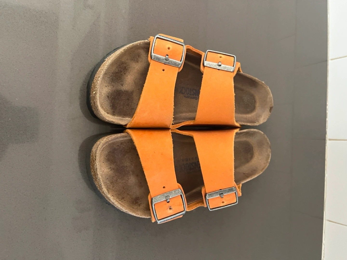41Pre-owned Birkenstock Arizona sandals. Orange suede straps. Cork footbed. Double buckle design. Good used condition. Awesome colour for spring and summer! Regular width. Size 37 EU, women’s size 6-6.5. Pick up in Utopia