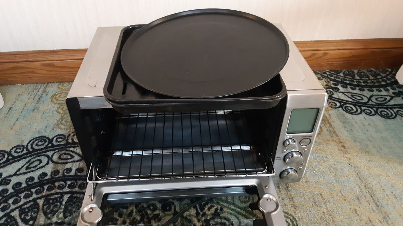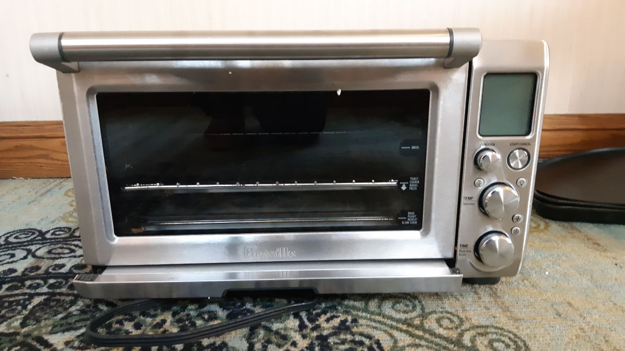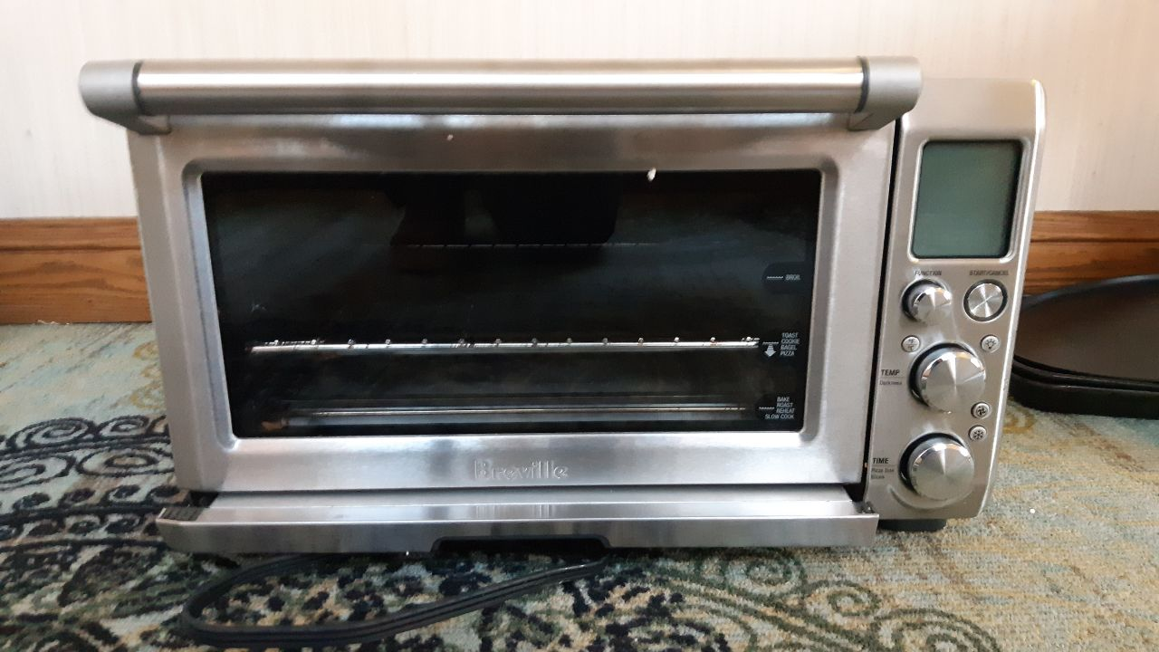Stainless steel Breville toaster oven. Model BOVB45BSSUSC. Includes baking pan and wire rack. Digital controls, various functions.