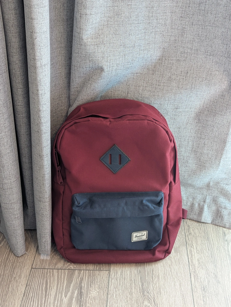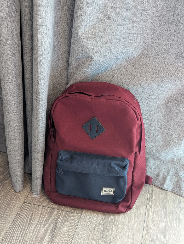 Burgundy Herschel Supply Co. backpack. Features a main compartment, smaller front pocket, and adjustable straps. Great for school or everyday use.