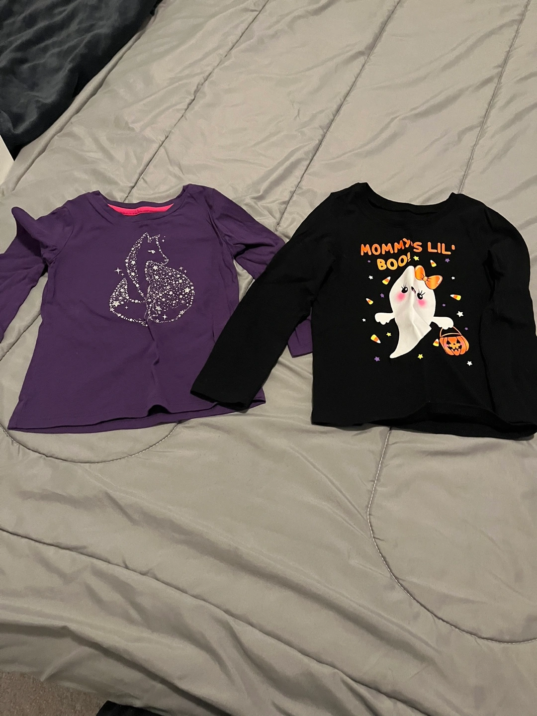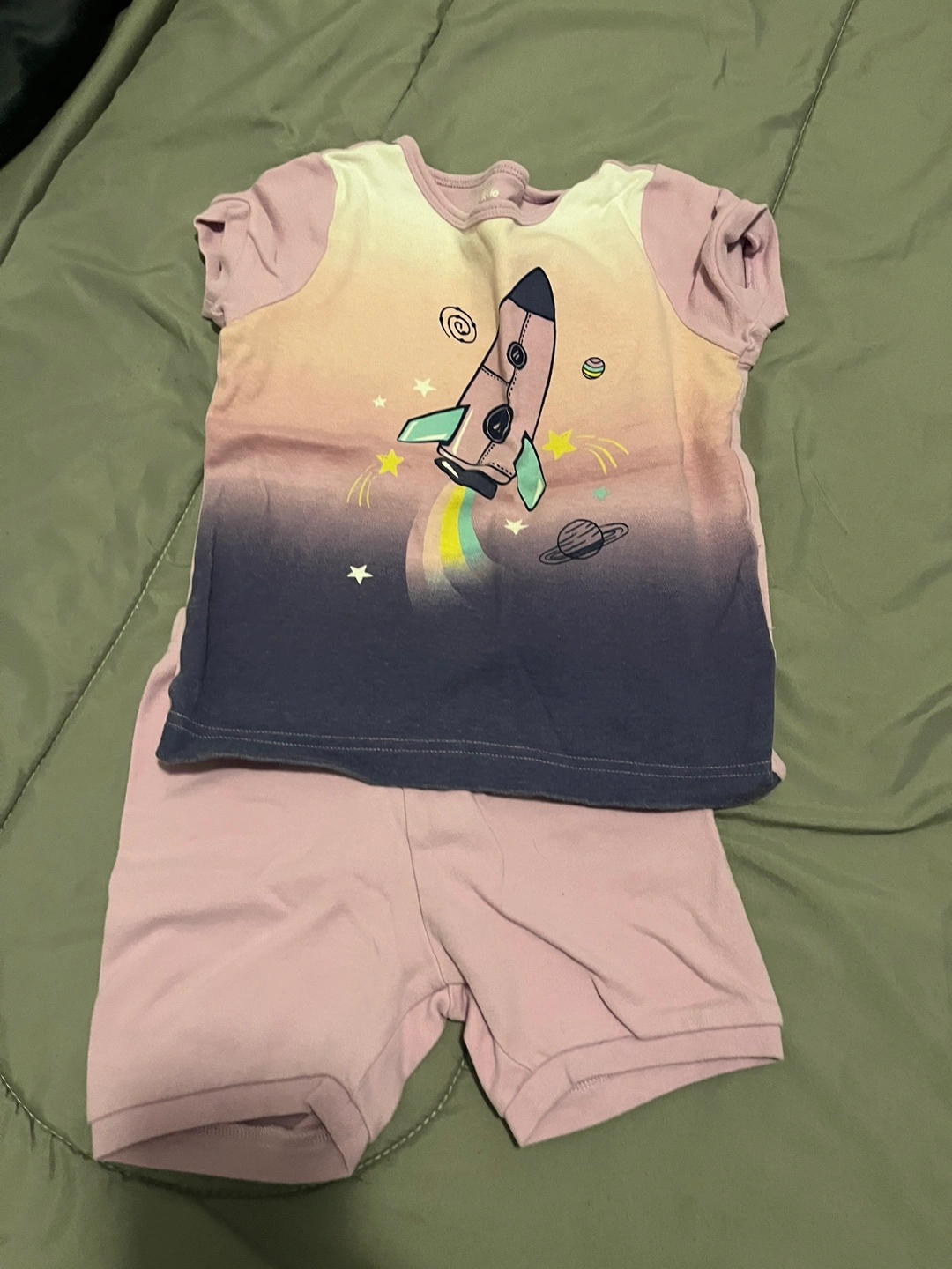 55Bundle includes four tops. Red Canada Day themed t-shirt, purple and black long-sleeved shirts and lavender shorts set with rocket design.