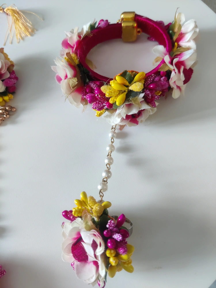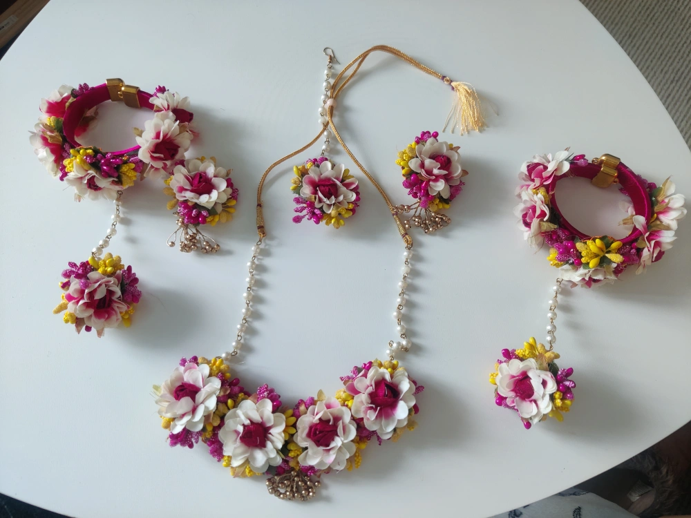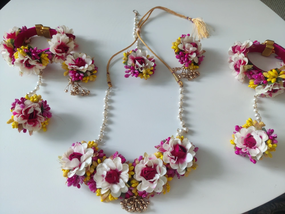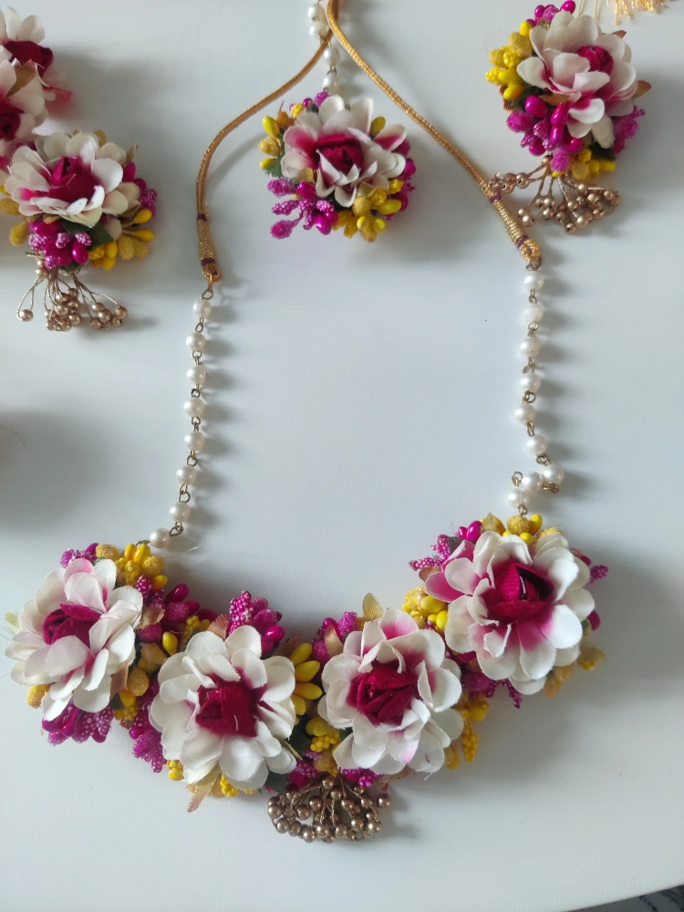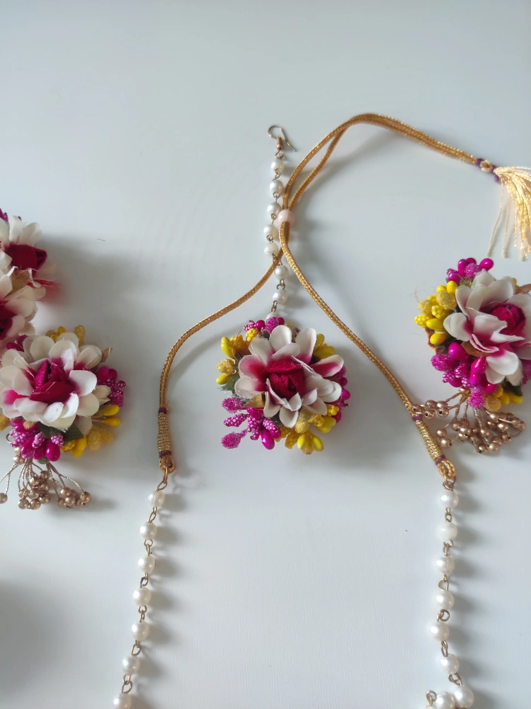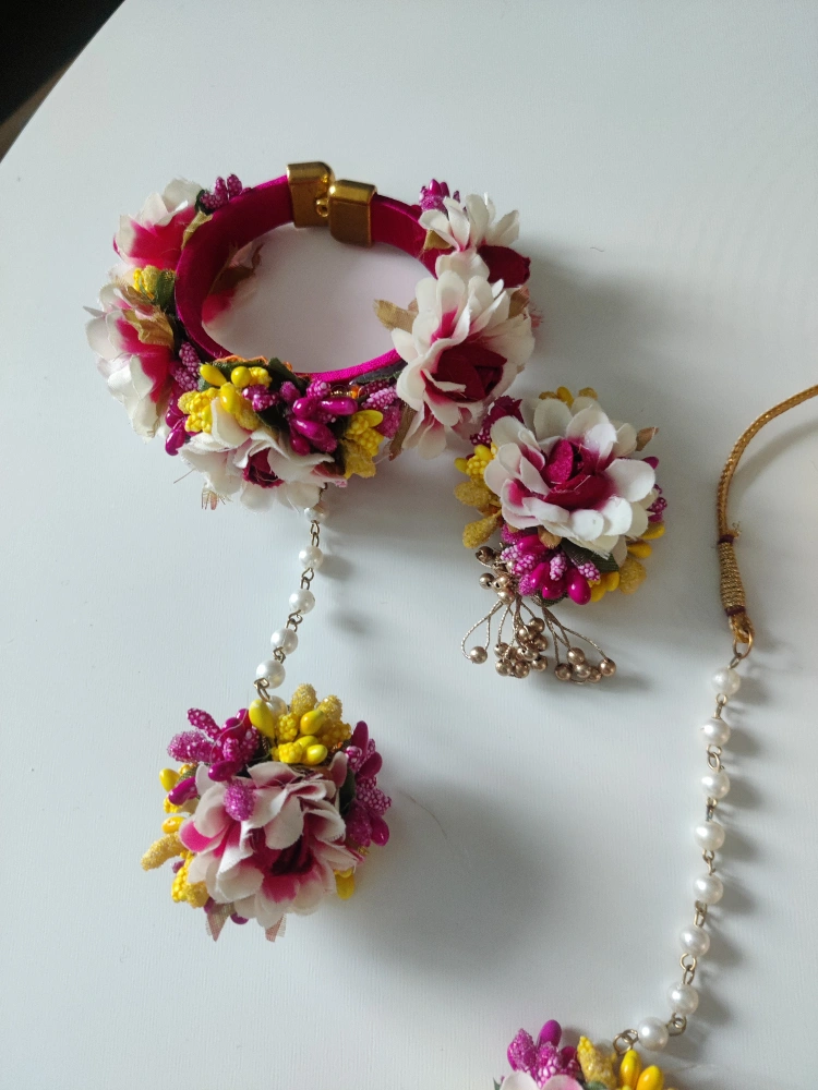 Beautiful floral jewellery set. Includes necklace, two bangles and attached rings, two matching earrings and a head piece / tikka. Features white, pink and yellow flowers. Pearl accents. Gold detailing.