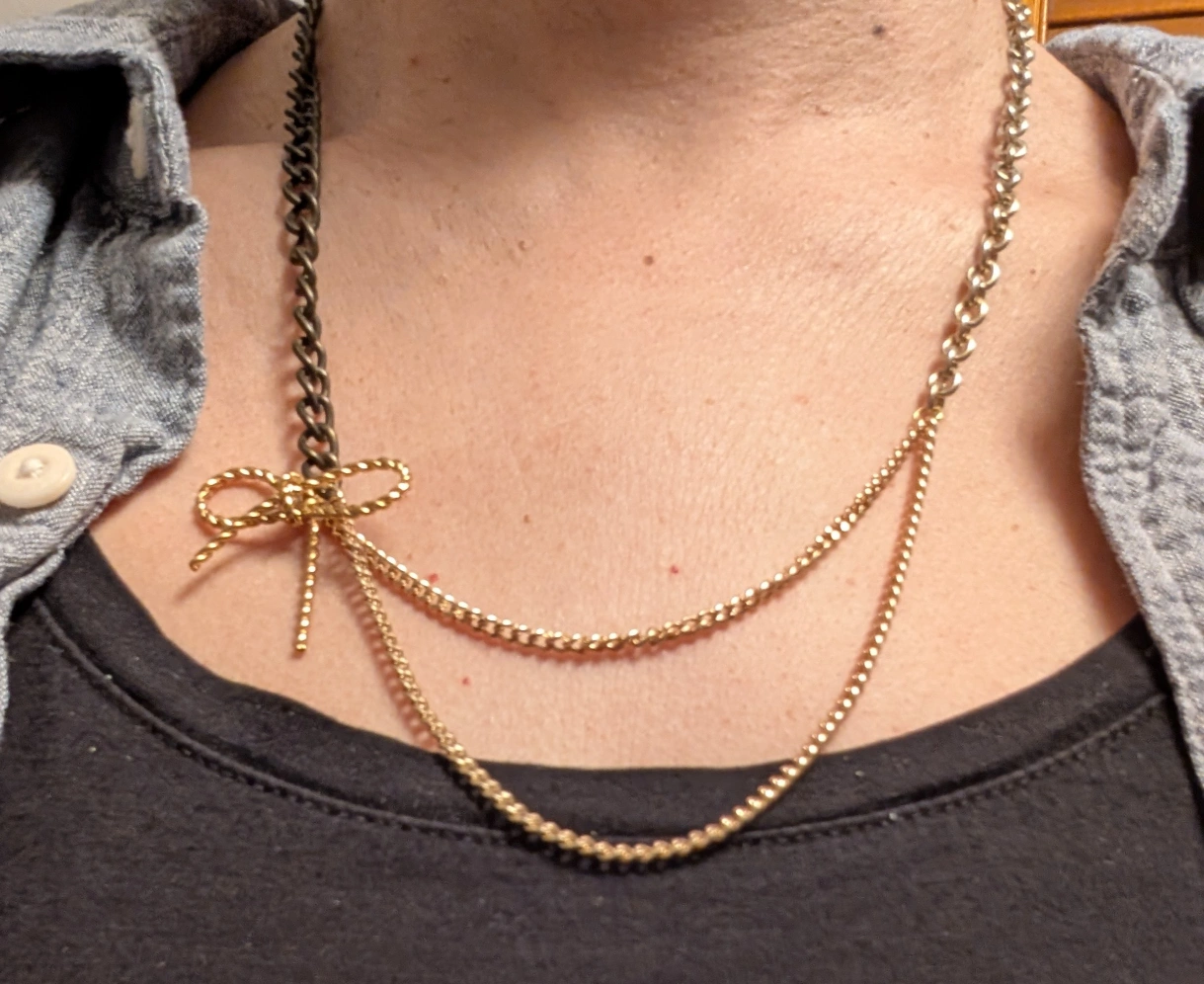 Layered necklace featuring a dark chain and two thinner gold chains. Gold bow accent. Unique statement piece.