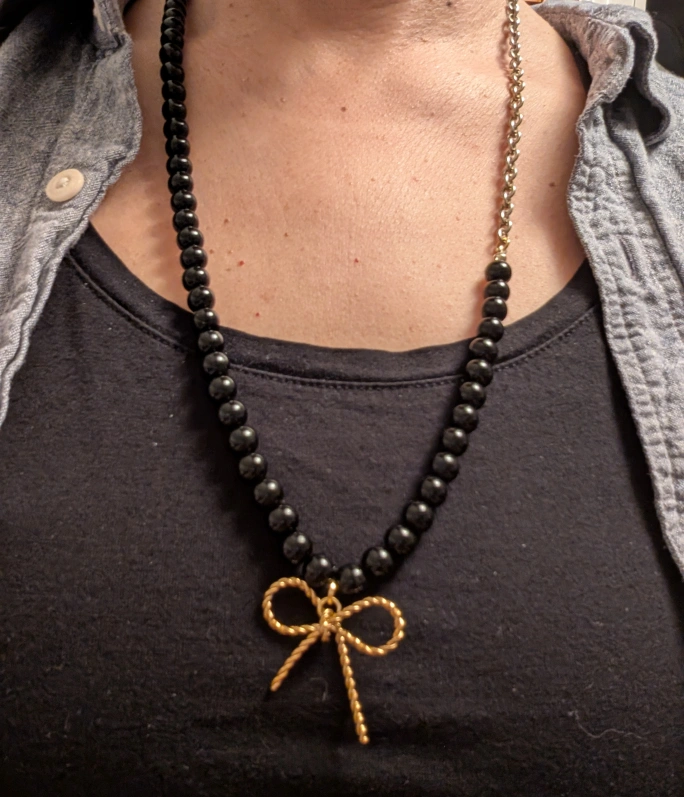420Elegant black beaded necklace. Features a gold twisted bow pendant. Beautiful statement piece. Perfect for everyday wear or special occasions.
