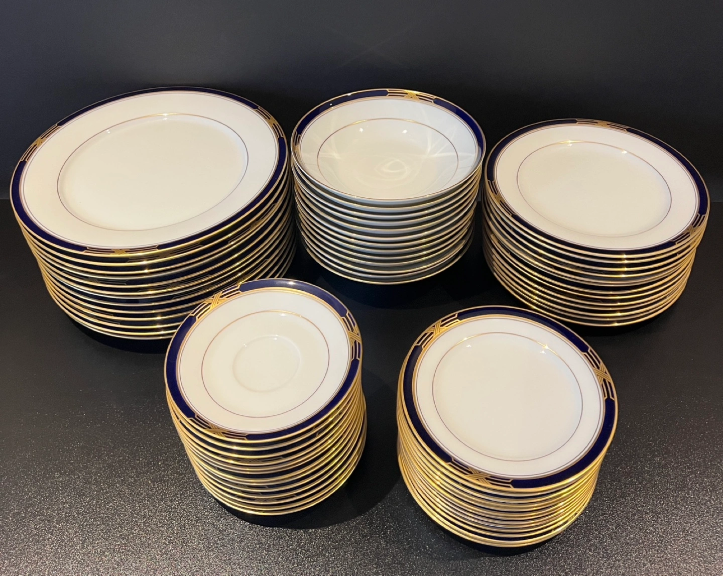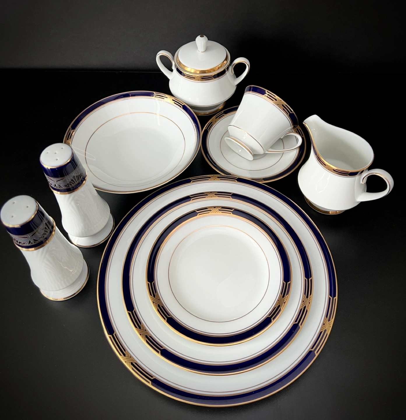 Part of Noritake’s elite Legacy line, the “Lake Worth” 3699 pattern (1986–1996) features white porcelain with deep cobalt borders and 24k gold accents. This full-service set is perfect for collectors, formal entertaining, weddings, or heirloom gifting.